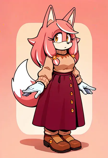 ConductorsWife, 1girl, pink fur, long pink hair, large fox-like ears, warm outfit, beige sweater, maroon skirt with button accents, white gloves, brown shoes, sonic the hedgehog, orange eyes,