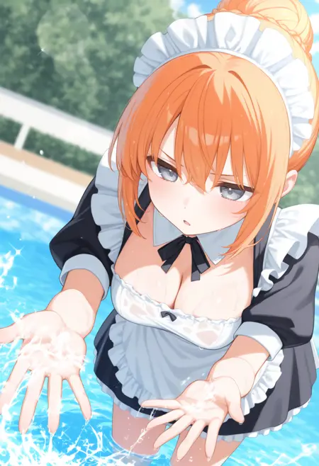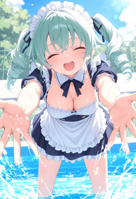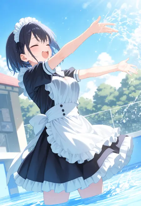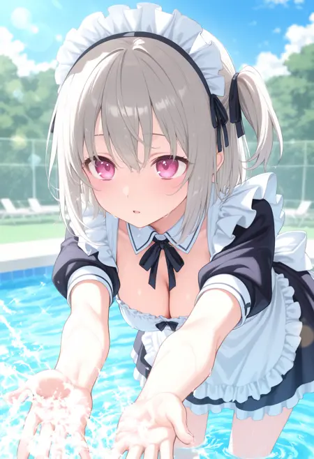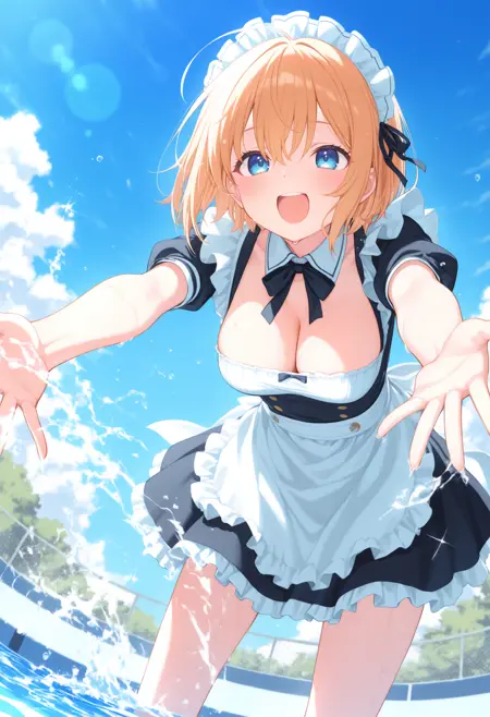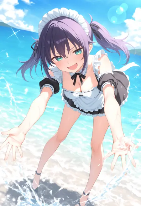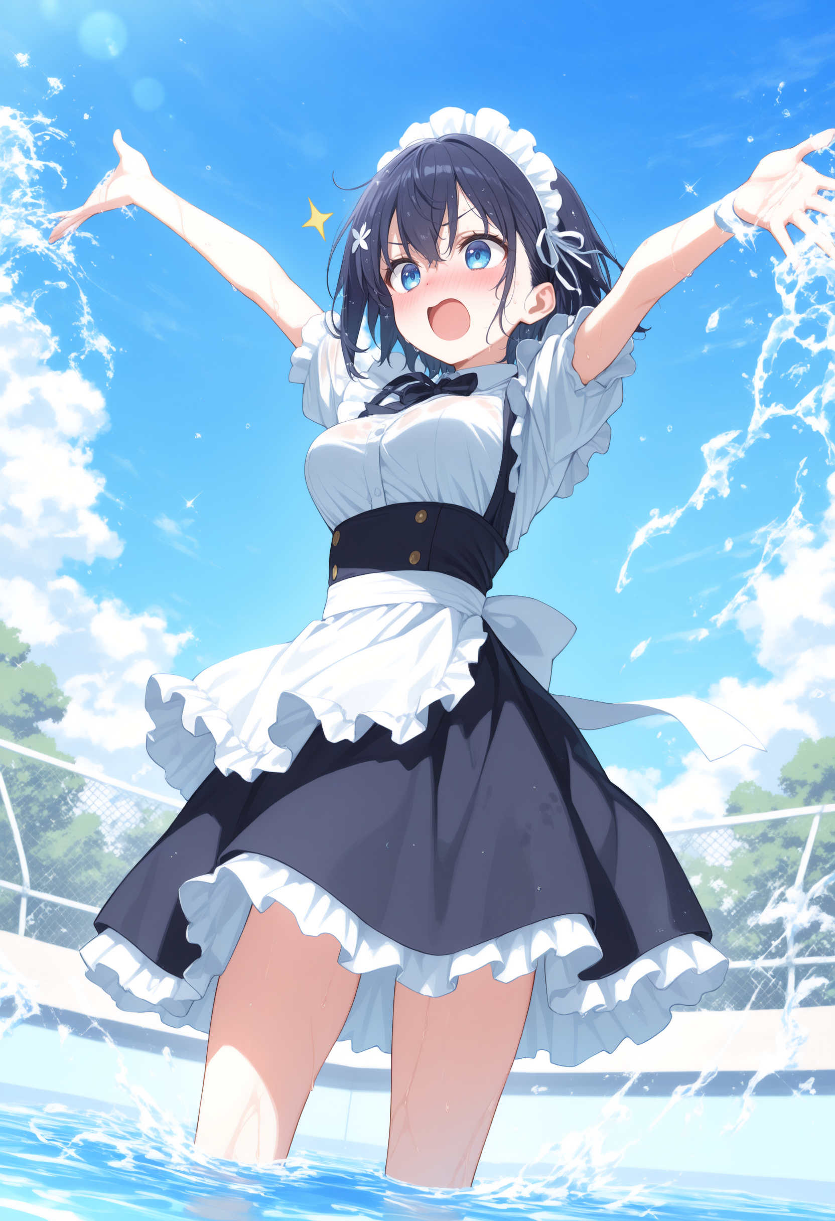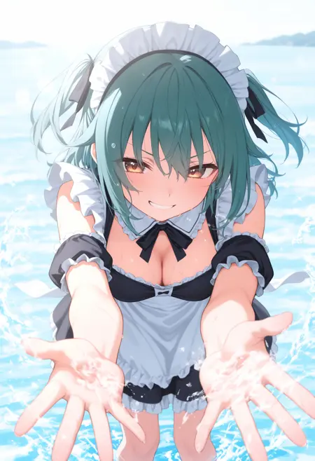 海やプールなどにて手で水を掬ってこちらにかけてくる体勢のLoRAです。Illustriousはプロンプトだけでもかなりそれっぽい体勢は取るものの手の位置や水しぶきが安定しないのを矯正します。