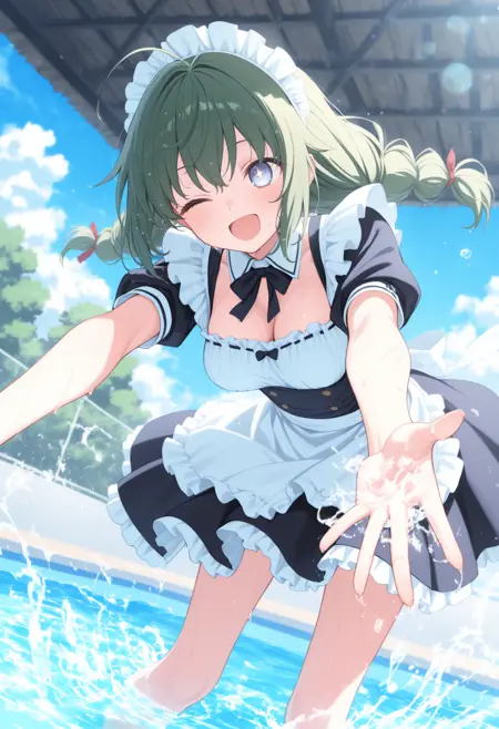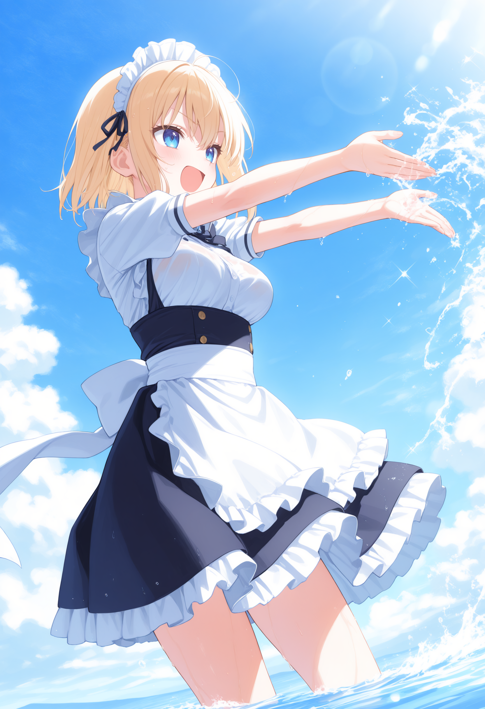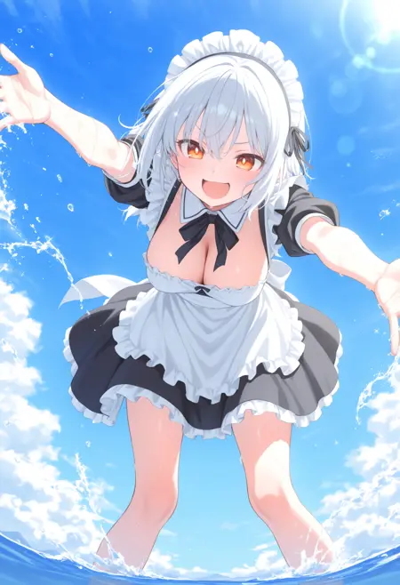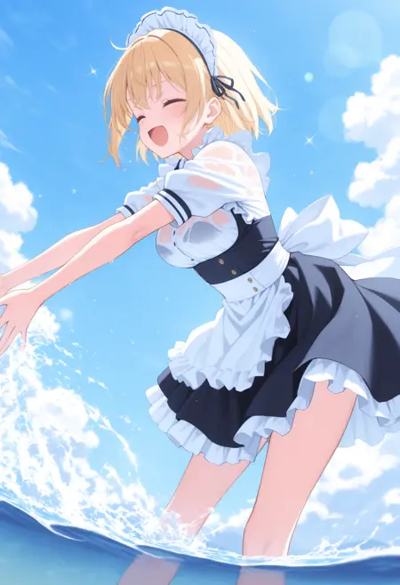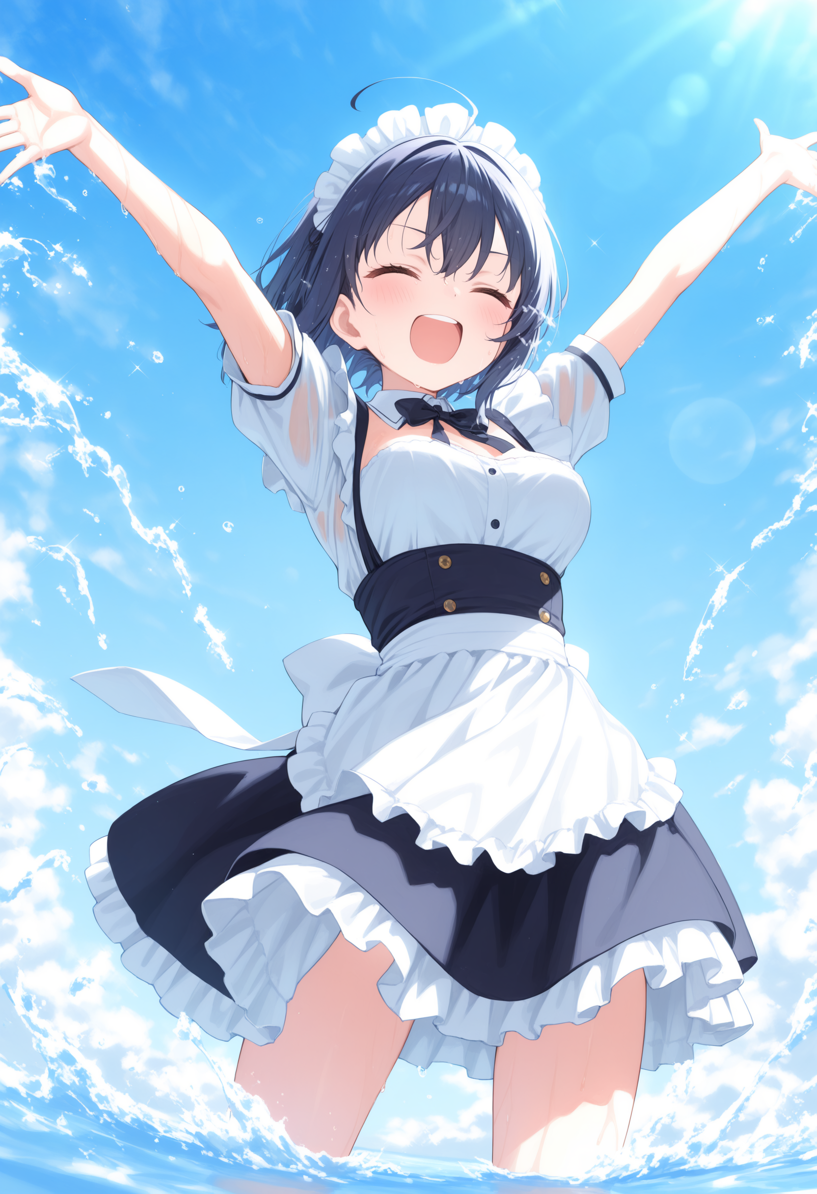 海やプールなどにて手で水を掬ってこちらにかけてくる体勢のLoRAです。Illustriousはプロンプトだけでもかなりそれっぽい体勢は取るものの手の位置や水しぶきが安定しないのを矯正します。