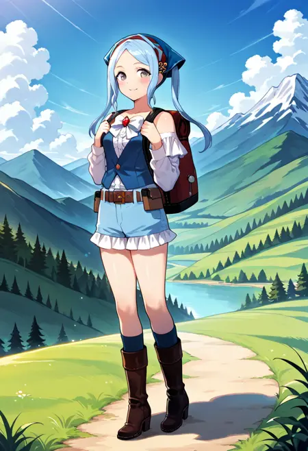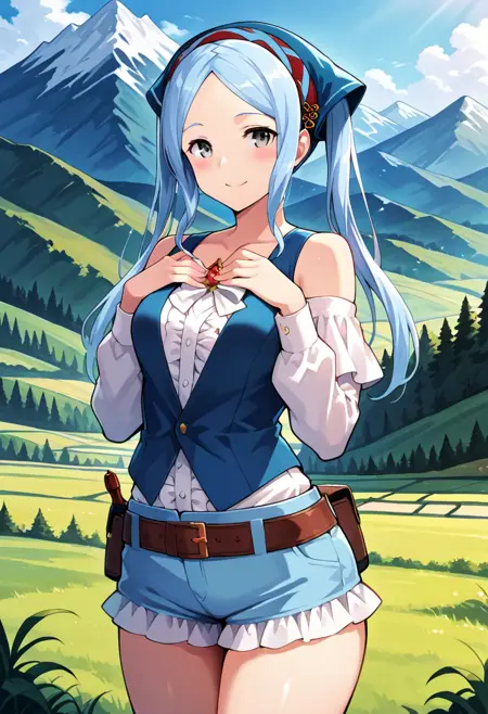 default clothes : flora_def,long sleeves,maid headdress,apron,black thighhighs, high heel boots, (if you want to delete her collar, recommend to add ''no collar'')