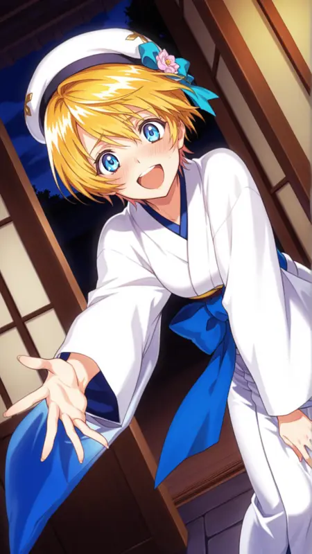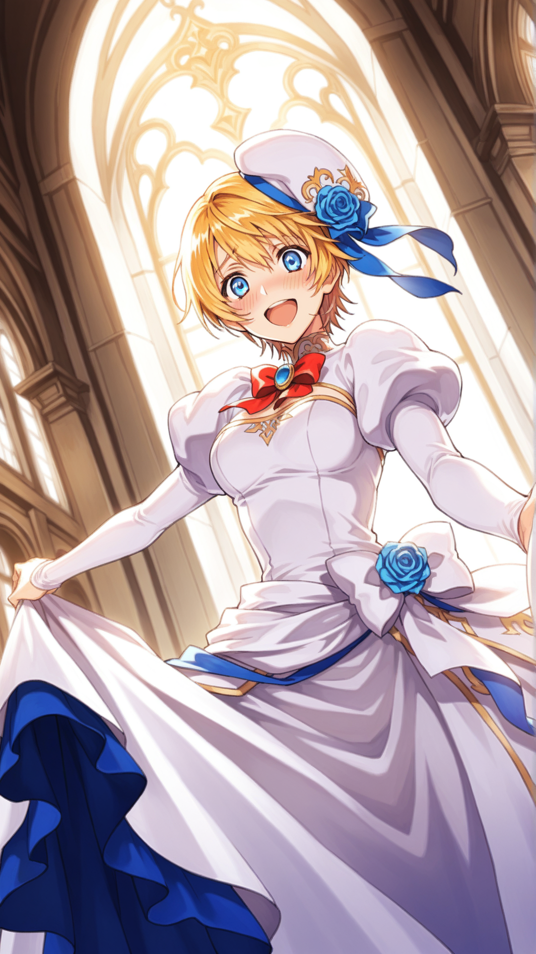 Outfit:hat, puffy sleeves, boots, long sleeves, dress, blue pantyhose, white footwear, thighhighs,