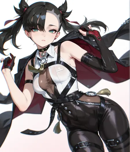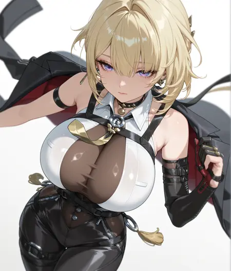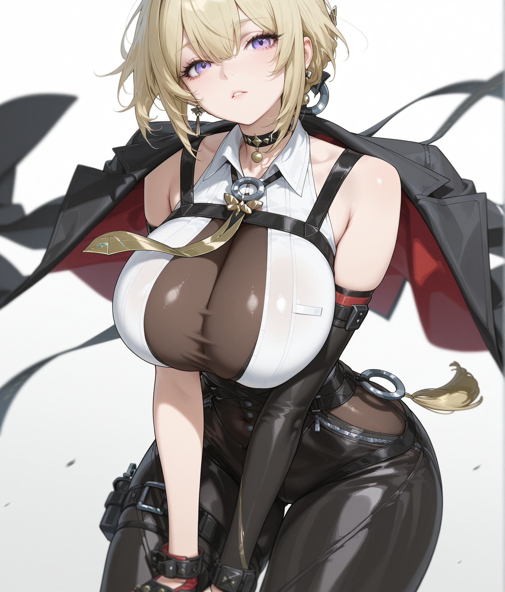 shirt, long sleeves, jacket, white shirt, open clothes, necktie, sleeveless, collared shirt, choker, belt, coat, black jacket, collar, see-through, sleeveless shirt, covered navel, black choker, skindentation, bodysuit, black belt, black coat, open coat, cuffs, jacket on shoulders, bodystocking, taut clothes, tight clothes, harness, chest harness, coat on shoulders, chest strap,