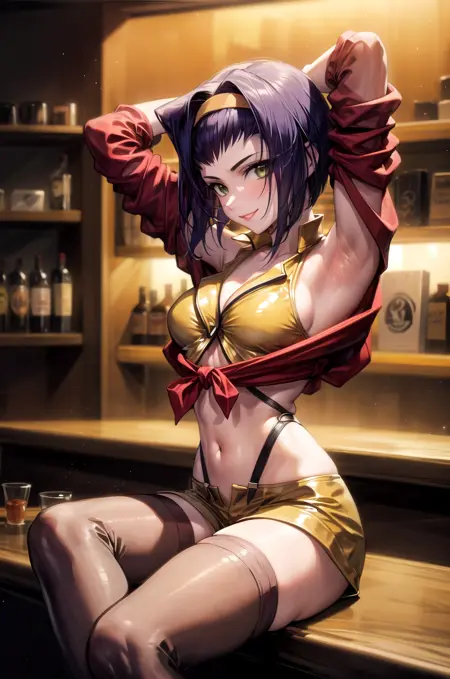 Prompt for main outfit is faye valentine, yellow hairband, yellow crop top, red shirt, off shoulder, tied shirt, suspenders, midriff, yellow shorts, thighhighs, high heel boots. Some poses with red jacket might be problematic because it sometimes becomes obvious that parts around arms and parts around chest are not connected. Adding long sleeves can help a bit then. Also if doing open top like I did on second image use open clothes, open shirt and put red shirt, off shoulder, tied shirt into negatives. that helps not just with the shirt, but also separates in middle way better.
