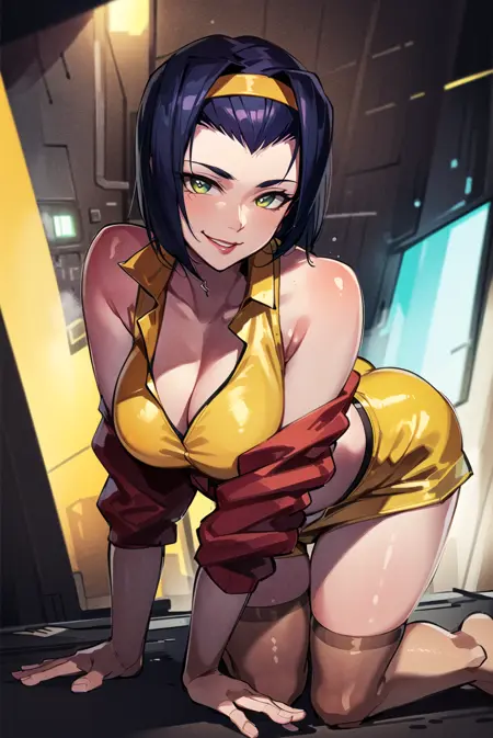 Prompt for main outfit is faye valentine, yellow hairband, yellow crop top, red shirt, off shoulder, tied shirt, suspenders, midriff, yellow shorts, thighhighs, high heel boots. Some poses with red jacket might be problematic because it sometimes becomes obvious that parts around arms and parts around chest are not connected. Adding long sleeves can help a bit then. Also if doing open top like I did on second image use open clothes, open shirt and put red shirt, off shoulder, tied shirt into negatives. that helps not just with the shirt, but also separates in middle way better.