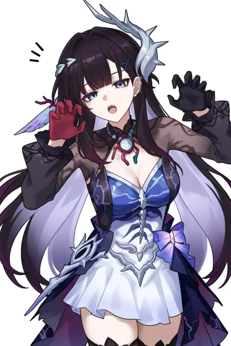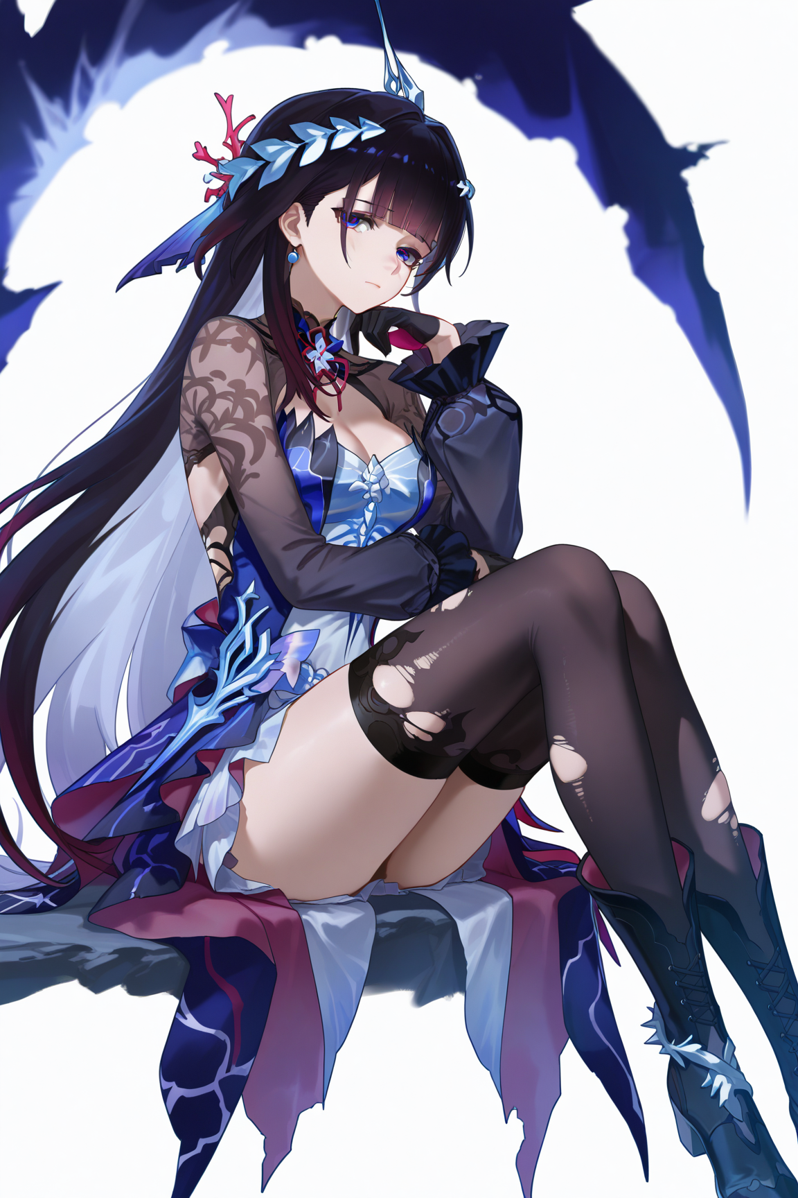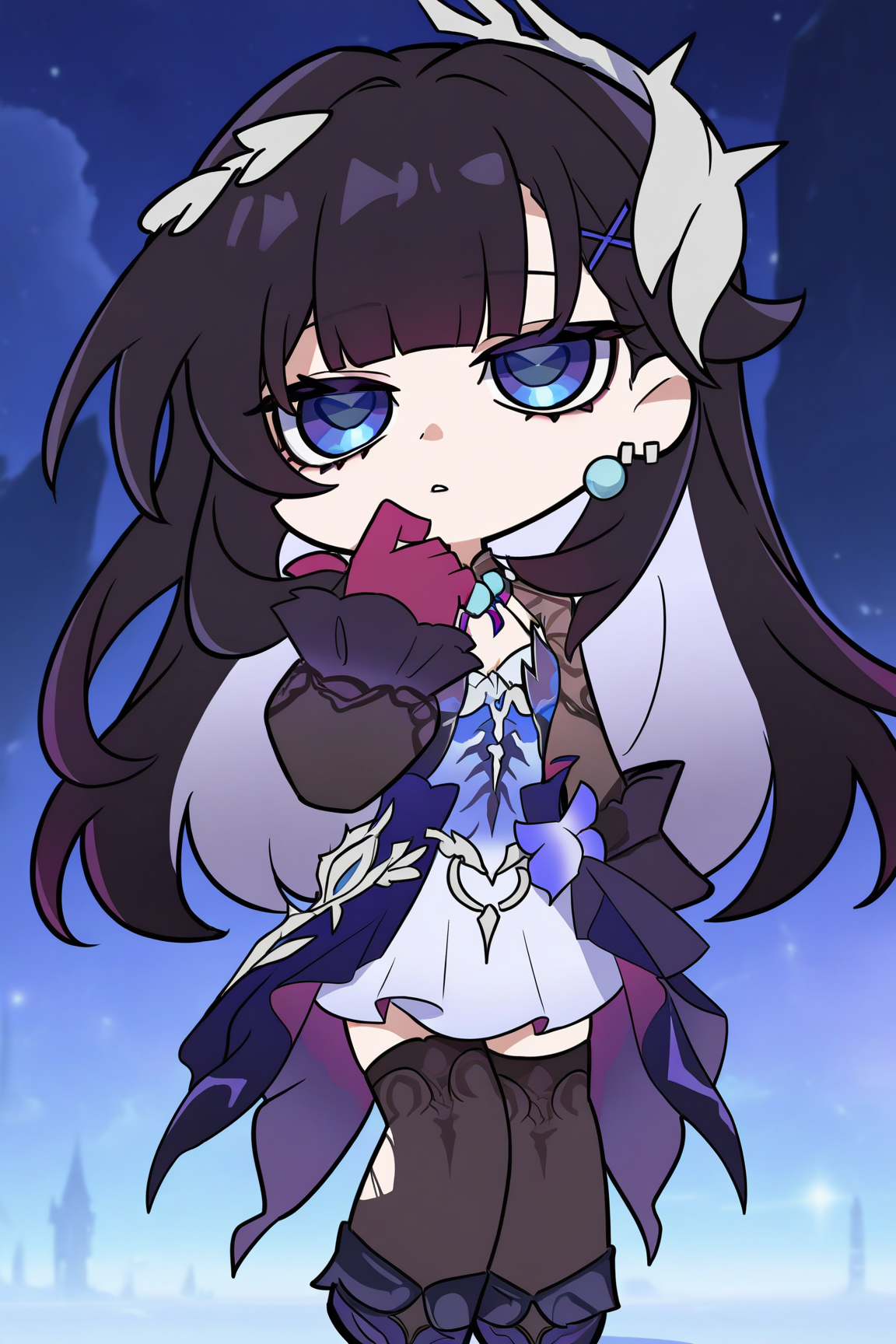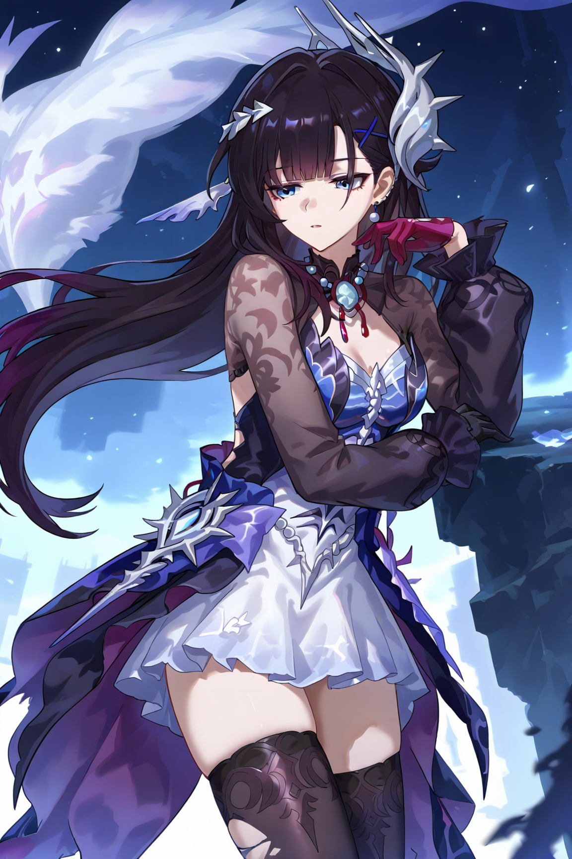 hysilens \(honkai star rail\), 1girl, black hair, blue eyes, thighhighs, x hair ornament, hair ornament, long hair, jewelry, gloves, dress, earrings, black thighhighs,