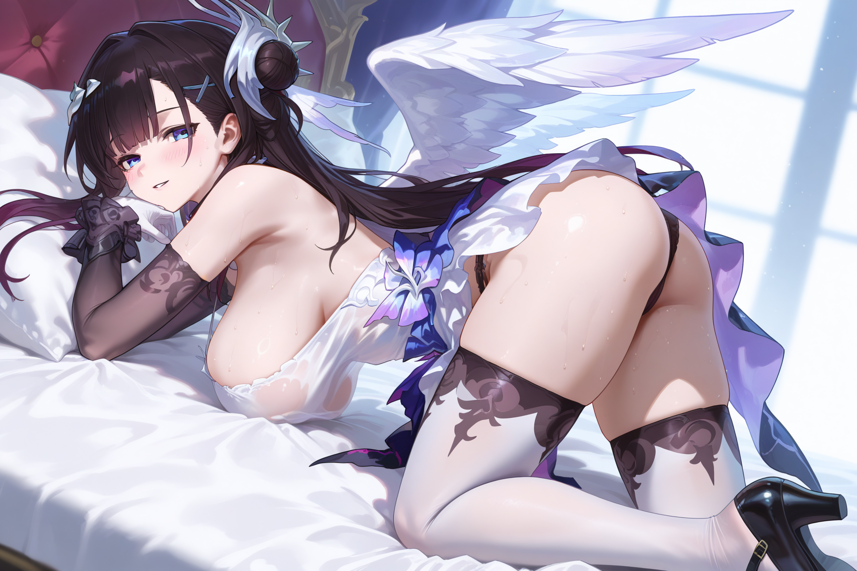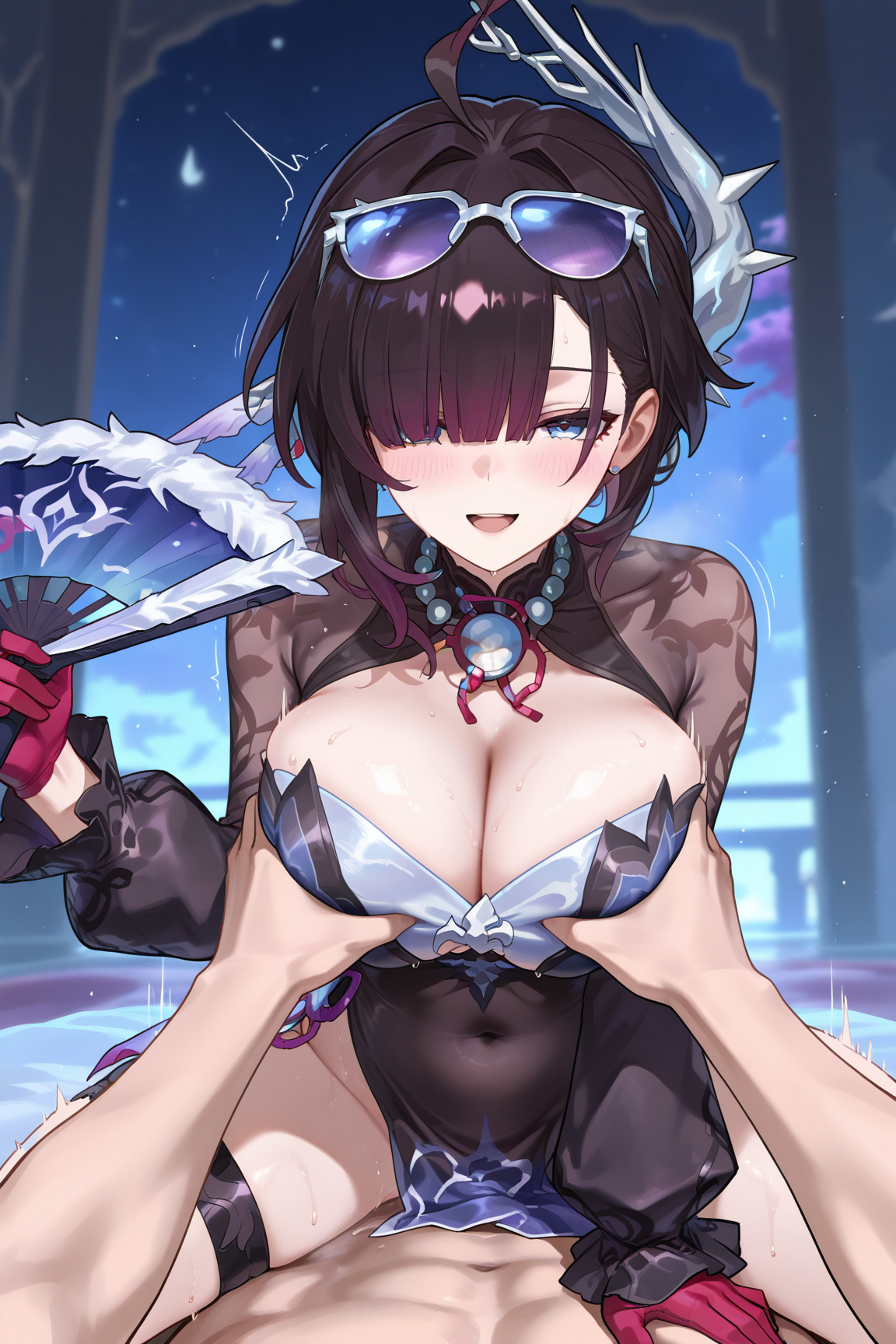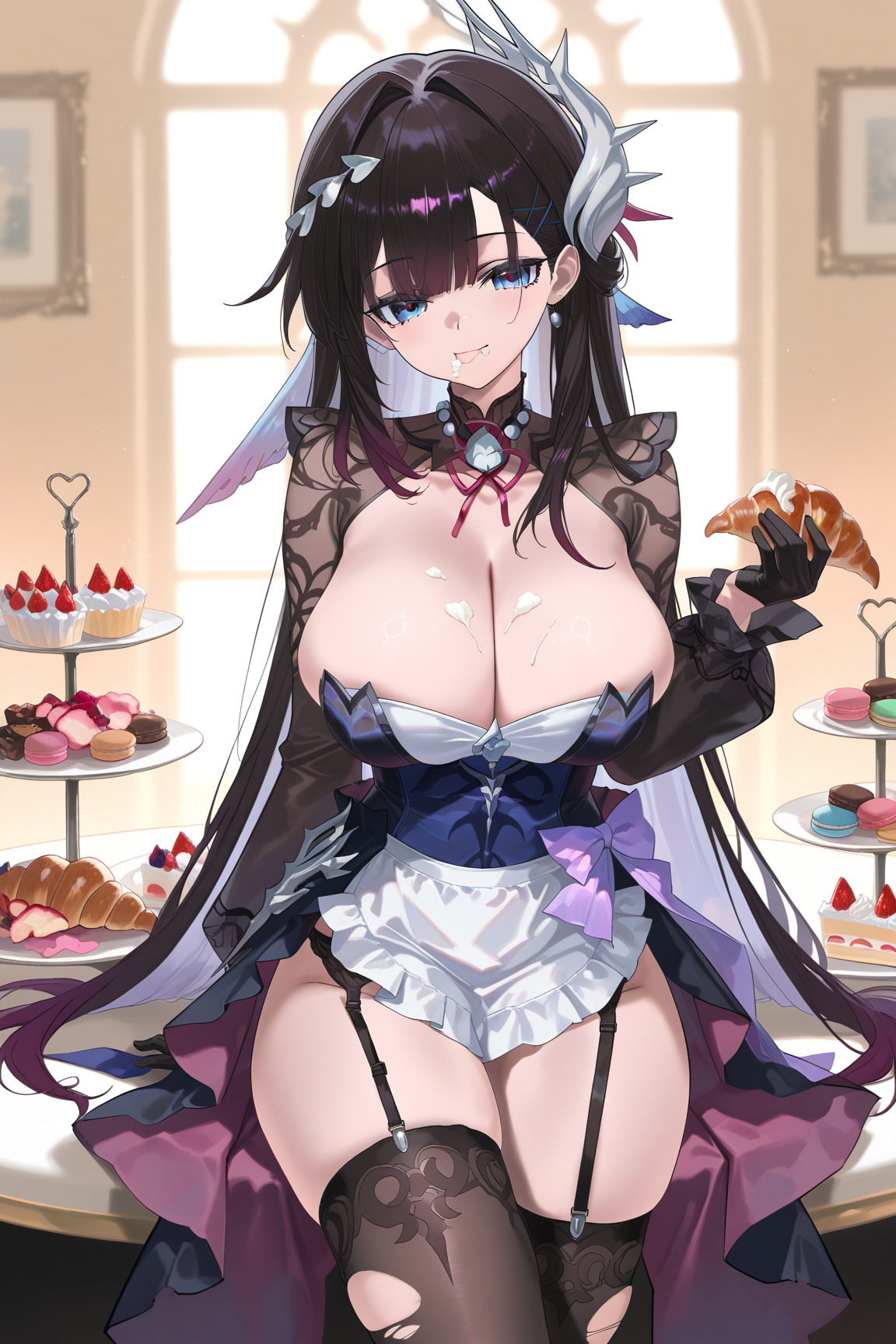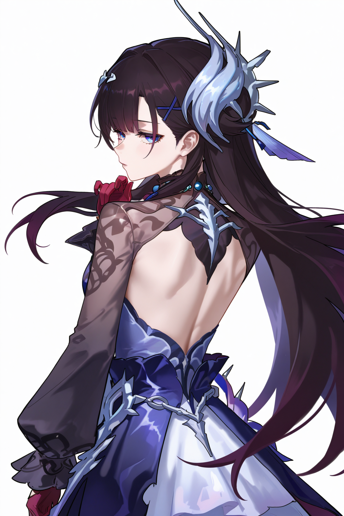hysilens \(honkai star rail\), 1girl, black hair, blue eyes, thighhighs, x hair ornament, hair ornament, long hair, jewelry, gloves, dress, earrings, black thighhighs,