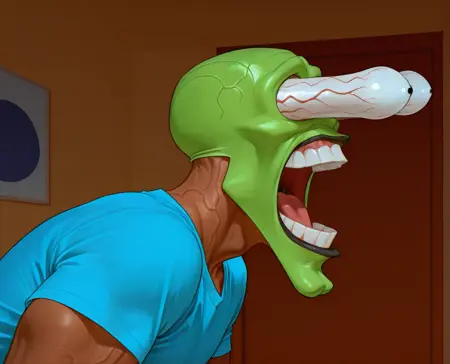 긍정 프롬프트에 사용 가능한 키워드: maskexag, 매우 벌어진 입, 긴 혀, 얼굴에서 뻗어나온 커다란 튀어나온 눈과 붉은 정맥, 흥분한, 놀란, 충격받은