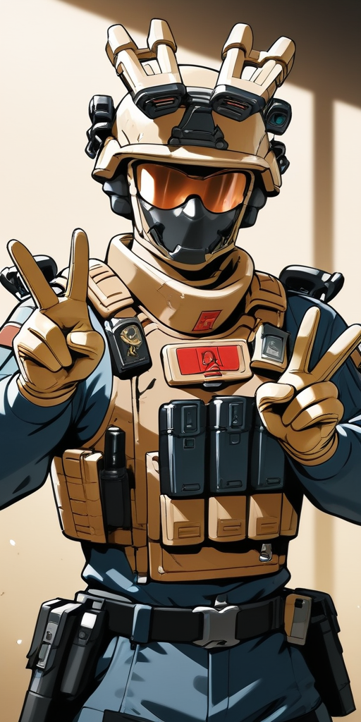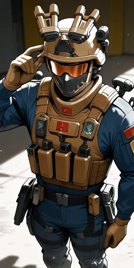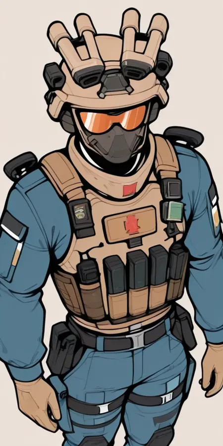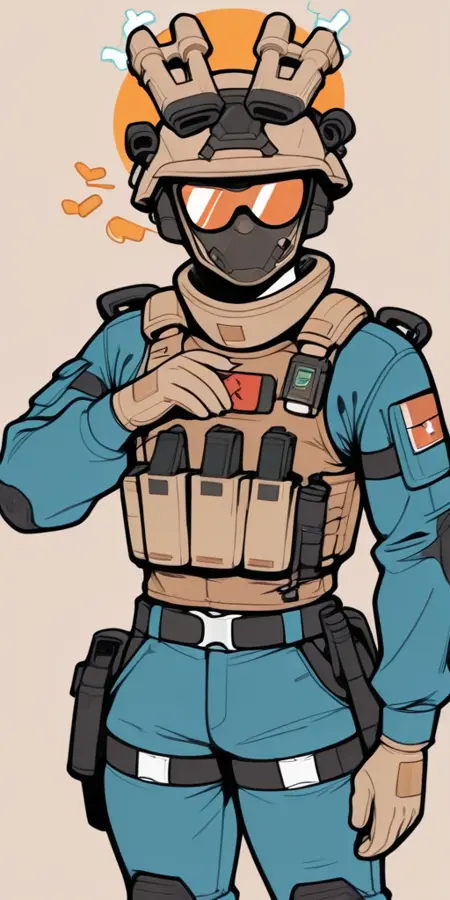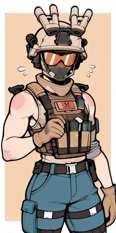 1boy, mask , brown helmet, glasses, antennas, solo ,military, bulletproof vest, uniform,blue pants ,brown vest ,glasses, gloves