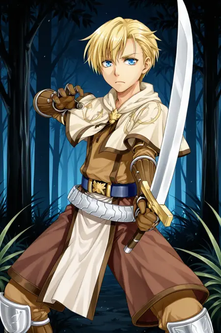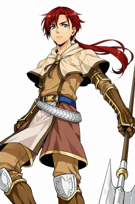 프롬프트: swdROMale, 장갑, 벨트, 겉옷, 찡긴 표정, 갈색 팔꿈치 장갑, 테이바드, 갈색 바지, 갈색 셔츠, 골반 커튼, 갑옷형 무릎 부츠