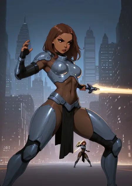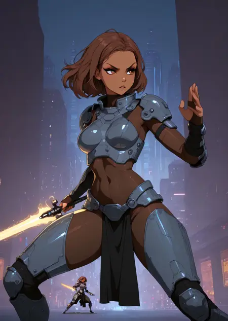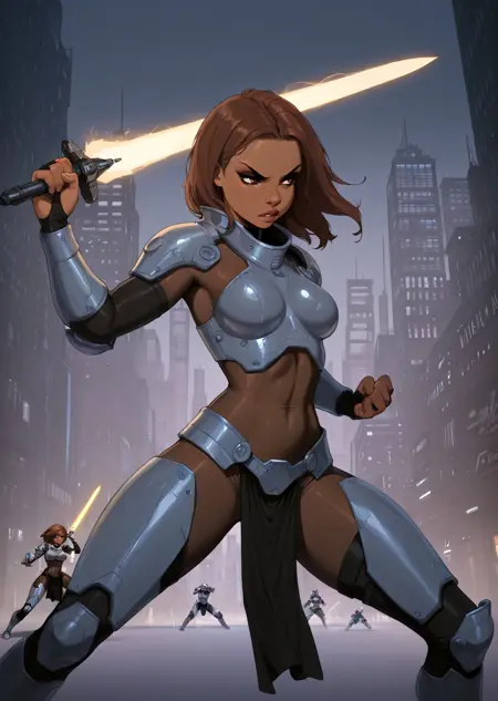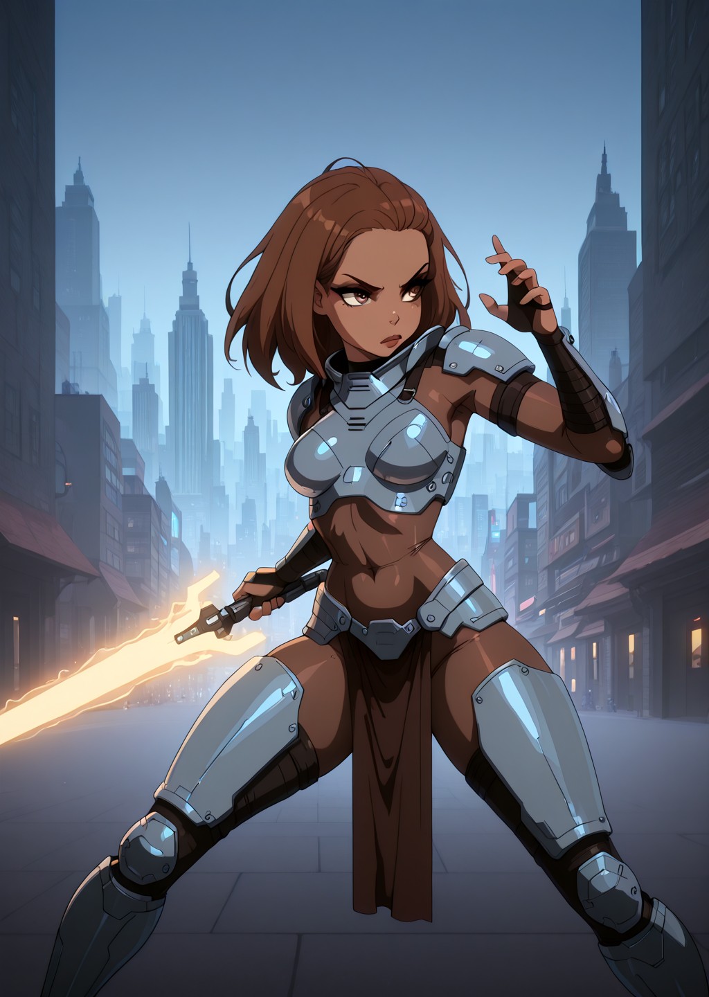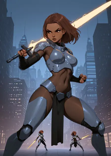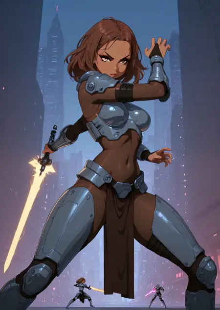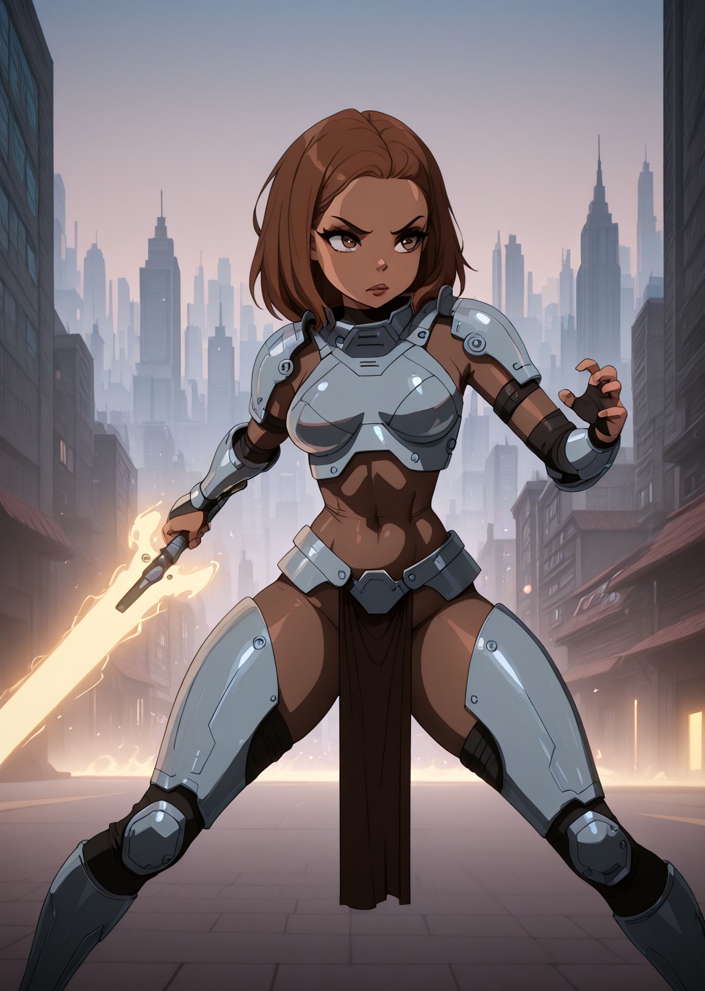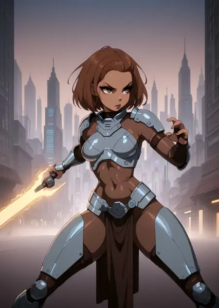 ArmKA, 검은 피부를 가진 여성, 갈색 머리카락, 바디스톡킹, 갑옷 상의, 갑옷 골반 커튼, 무기 들고 있음, 에너지 검