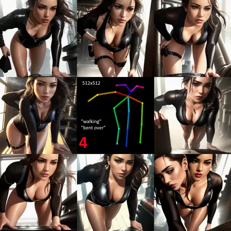 512x640과 640x512 모두에 잘 작동합니다. 프롬프트에서 "kneeling" 대신 "crawling"을 사용하고 각도를 "from_below"로 바꾸면 흥미로운 결과도 도출되지만, 출력 시 팔이 약간 짧아지는 경향이 있습니다.