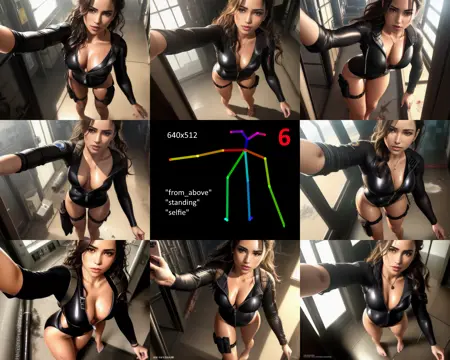 6)自拍姿势,结果相当稳定。也可尝试使用“from_below”和“crawling”,从而获得完全不同的姿态——人物用手臂支撑身体,呈现出倚靠状态。