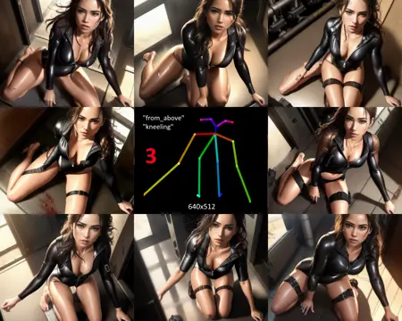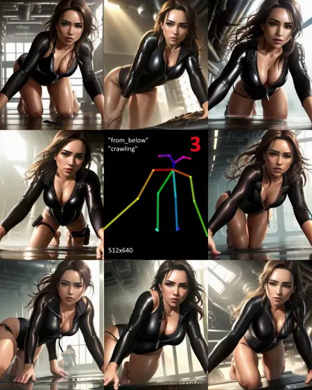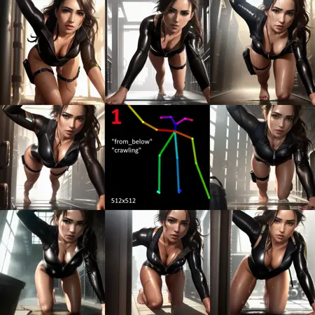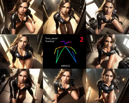 2)适用于512x640或640x512分辨率。当将视角改为“from_below”并用“crawling”替代“kneeling”时,也会产生一些有趣的效果,但输出中手臂通常略显偏短。