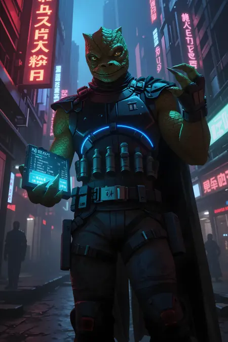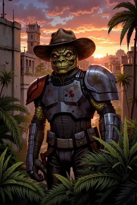 트리거는 "trandoshan alien"입니다. 때로는 "비늘 피부"와 "발톱"을 사용하여 이러한 특징을 강화할 수 있습니다.