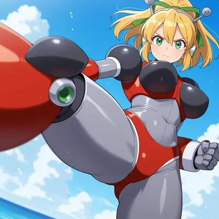 HyperRollMVC, robot girl, blonde hair, ponytail, antennae, headphones, hair ribbon, green ribbon, green eyes, armored gloves, armored boots, large breasts, bikini armor, bodysuit, mechanical arms, mechanical boots, black shoulder armor,