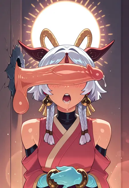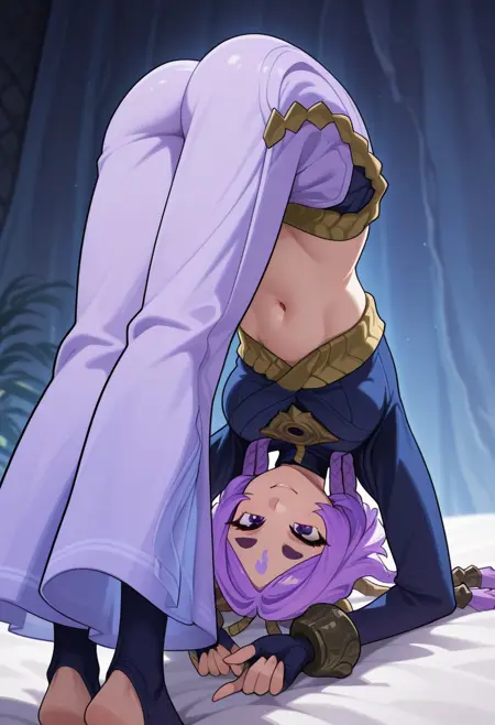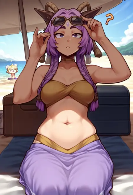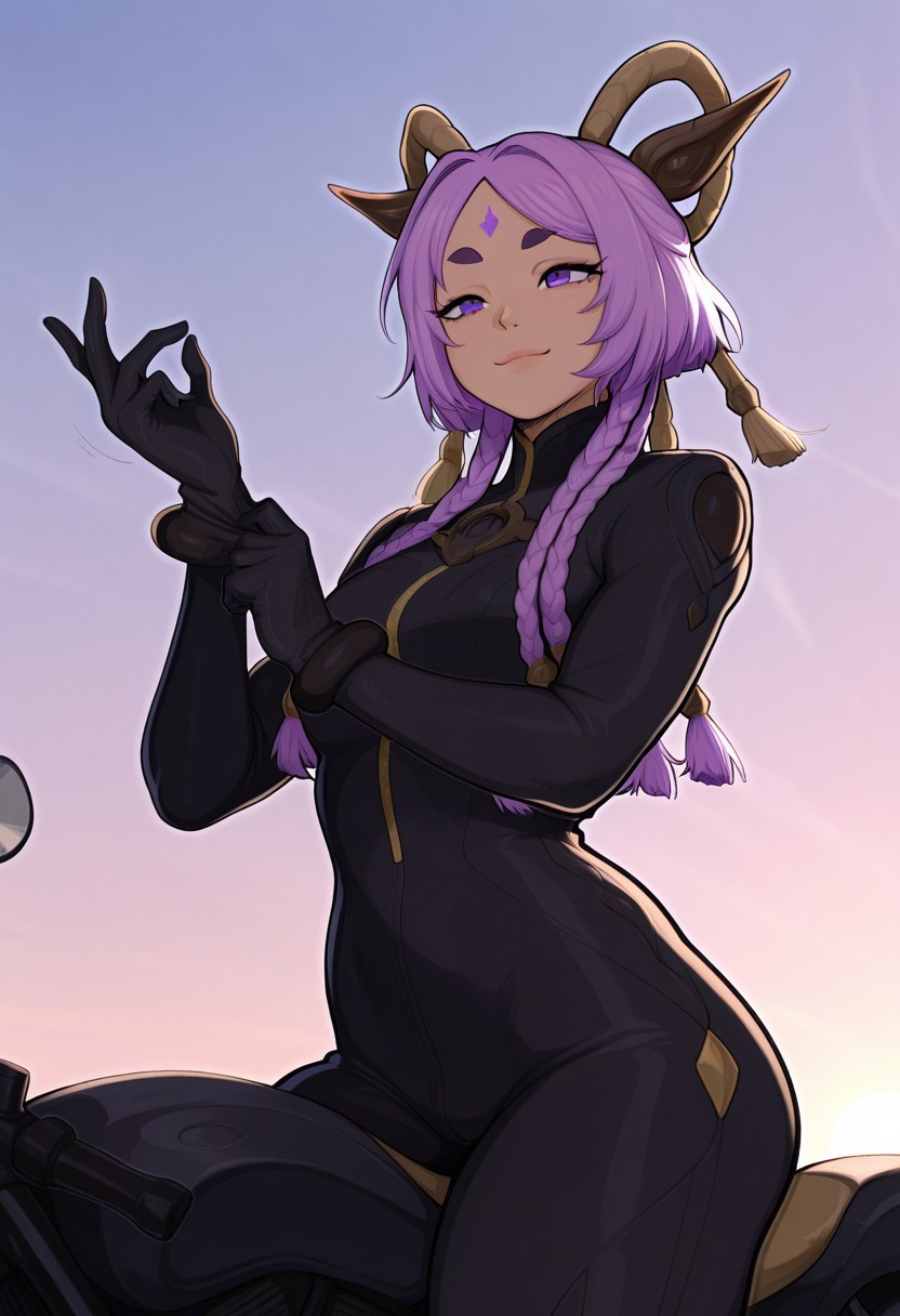 1girl, yunara_ionian, purple eyes, purple hair, 4braids, multiple braids, very short eyebrows, thick eyebrows, dark purple eyebrows, forehead mark, tassel, hair ornament, fake horn, hair tie, stomach line, belly button, (abs:0.5), (slightly muscular female:0.7),