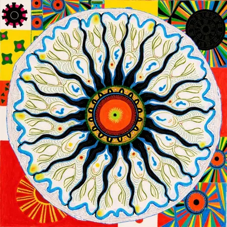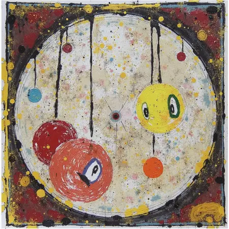 Whimsical narrative elements—tiny suns, butterflies, cassette-tape clouds—woven into the chaos