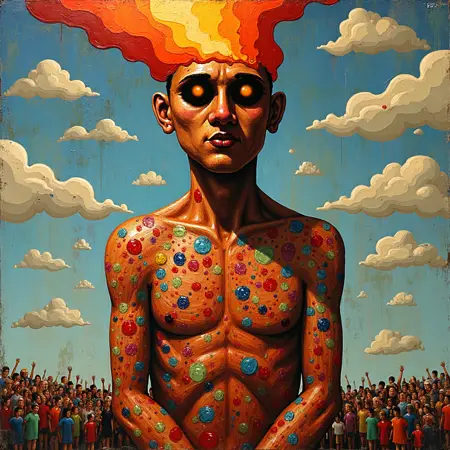Feelings first – Start with concepts (loss, joy, chaos, rebirth) or big ideas like political power and human nature; the training data labeled things using emotions, concepts, and feelings, not specific objects; the LoRA translates them into shapes and colour.