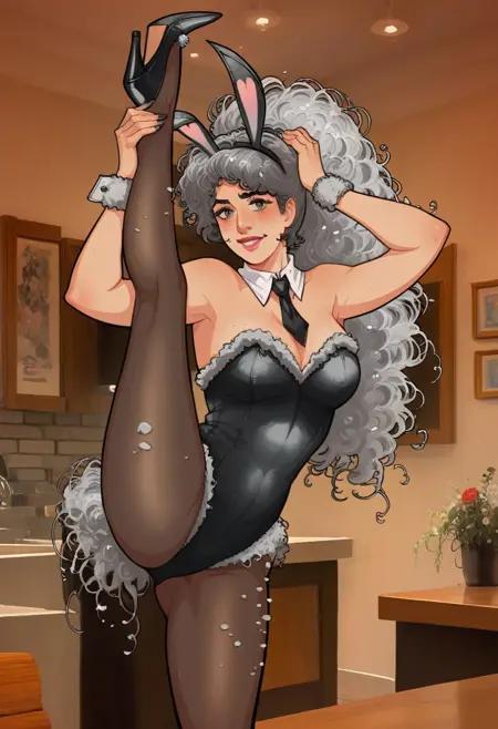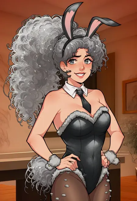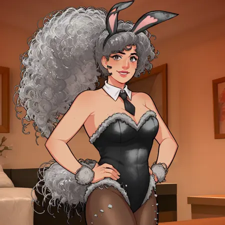 Tags are: "D0lly_DB, grey hair, big hair, long hair, grey eyes, medium breasts", outfit is "fake animal ears, rabbit ears, rabbit tail, wrist cuffs, detached collar, black necktie, black leotard, pantyhose, black high heels". Her pet rabbit she's always seen with in the game does occasionally manifest in images unasked for, so put "Fluffy toy" in the negative prompt to reduce that, or in the positive if you want him to show up.