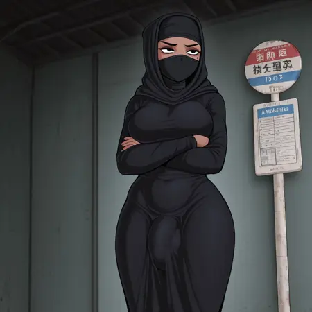 amina, 1girl, solo, dark skin, mole on cheek, niqab, tight black dress, black mouth mask