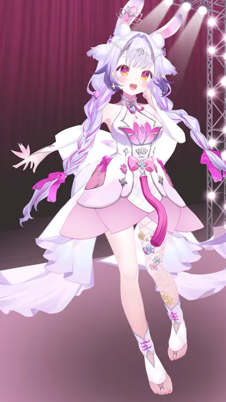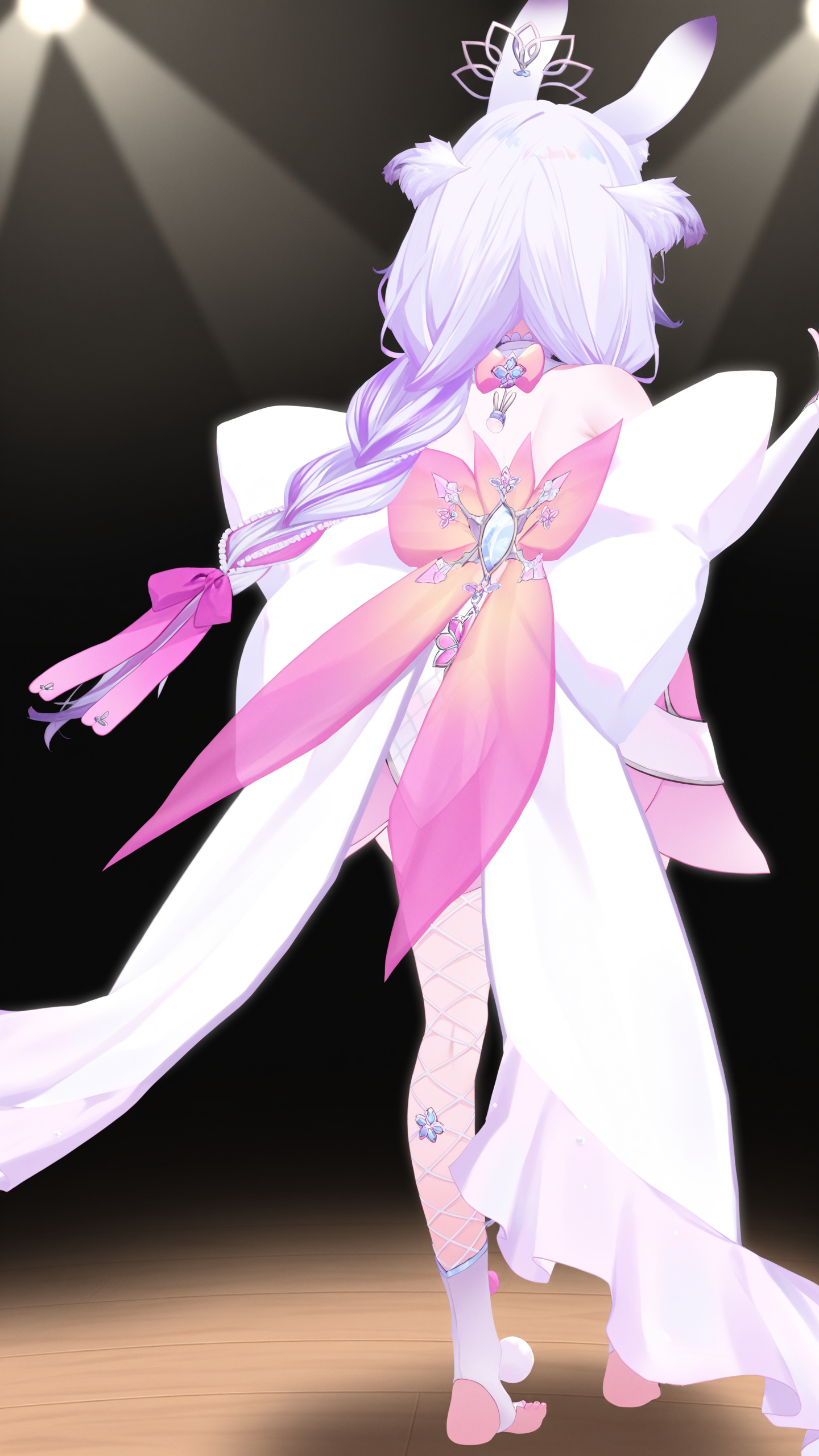 권장 사용: (xtms dress, lanyin reine:1.05), animal ear fluff, animal ears, bare shoulders, breasts, dress, gradient eyes, gradient hair, hair ornament, jewelry, light purple hair, low twin braids placed front and back, medium breasts, nail polish, no shoes, rabbit ears, ribbon, short white toeless stirrip legwear with ring, streaked hair, tassel, toenail polish, toenails, toes, virtual youtuber, white fingerless elbow gloves with ring and petals, huge back bowtie, single fishnet pantyhose