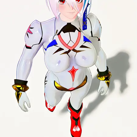 「短白发,红眼,蓝色耳环,白色紧身衣,红金装饰,红色未来风靴子」