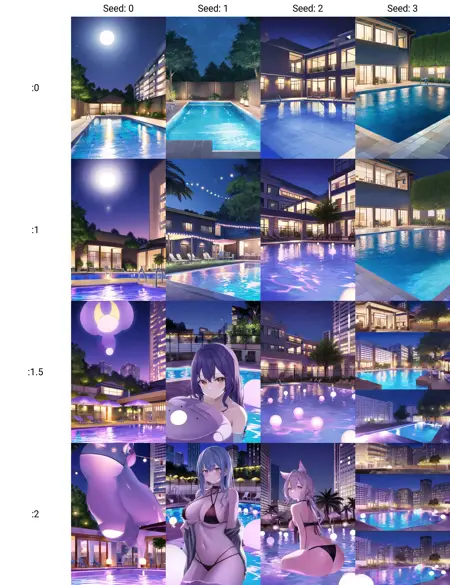 本意是学习ナイトプール这一概念(与night pools略有不同)。虽然并非所有ナイトプール都具有粉红色/紫色灯光的特征,但由于仅使用基础模型几乎从不出现这种效果,因此这是此LoRA的重点。实际上,仅通过巧妙的提示可能就能实现这一效果。