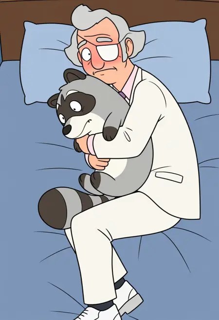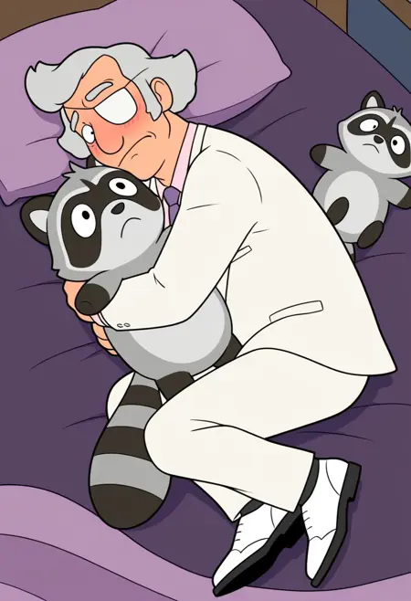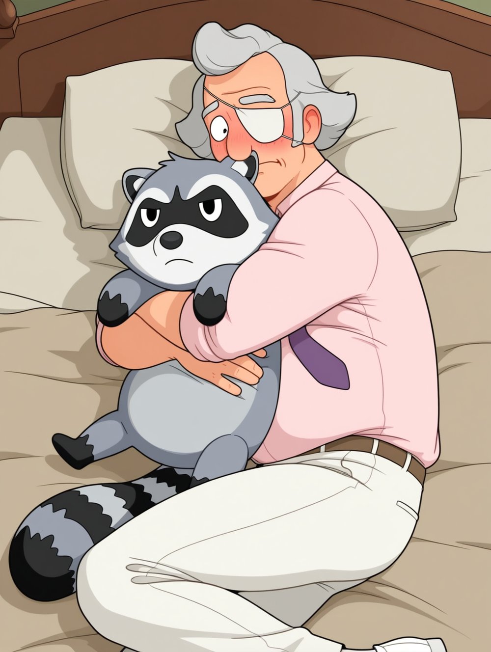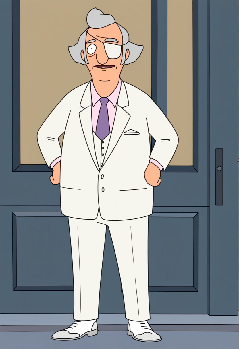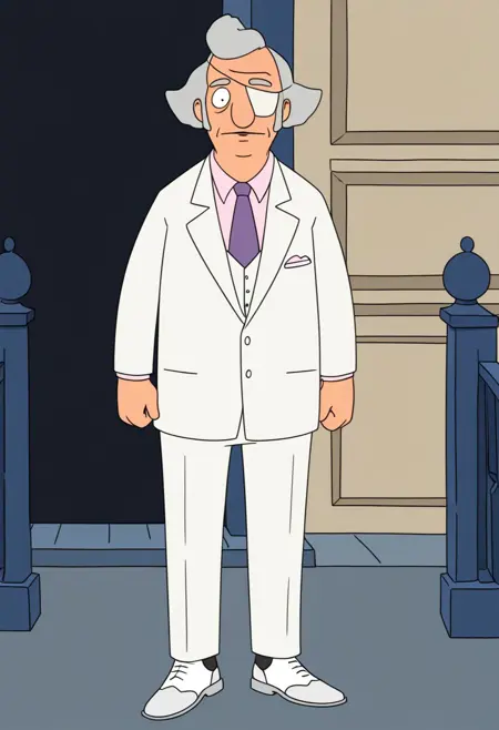1boy,solo,Calvin Fischoeder,old man,mature,chubby build,gray hair,short hair,white eyepatch,white suit,white pants,white shoes,pink collared shirt,purple necktie
