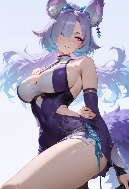 onlyxiada , 1girl, solo , animal ears, hair over one eye, purple eyes, breasts, mole, mole under eye, purple hair, long hair,
