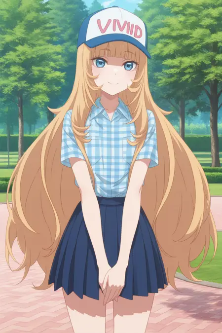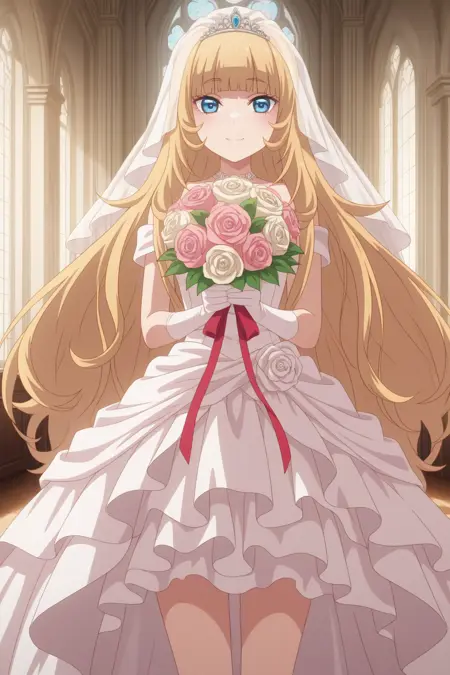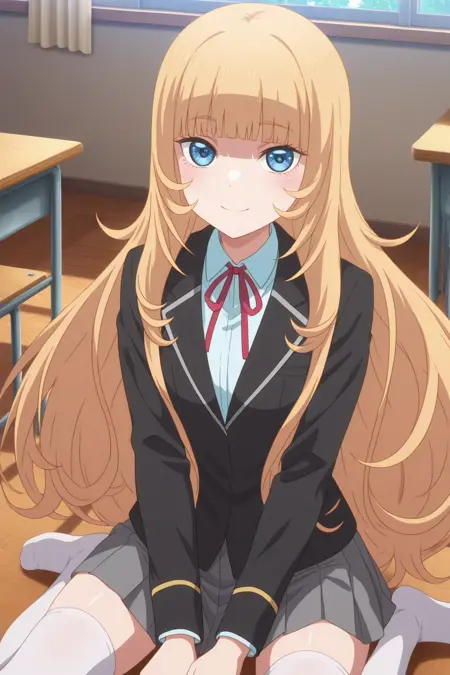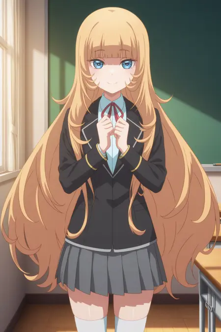 aamarie, blue eyes, blonde hair, blunt bangs, marieschool, school uniform, red neck ribbon, white dress shirt, black blazer, grey skirt, pleated skirt, white thighhighs, anime coloring,