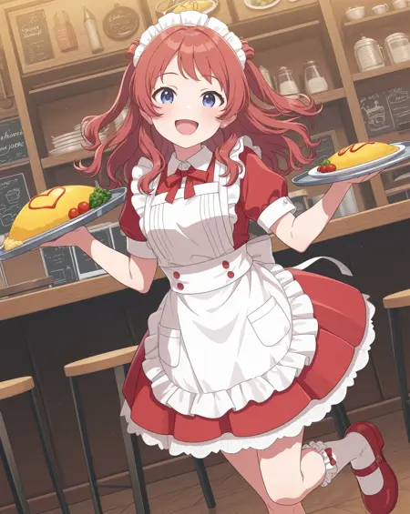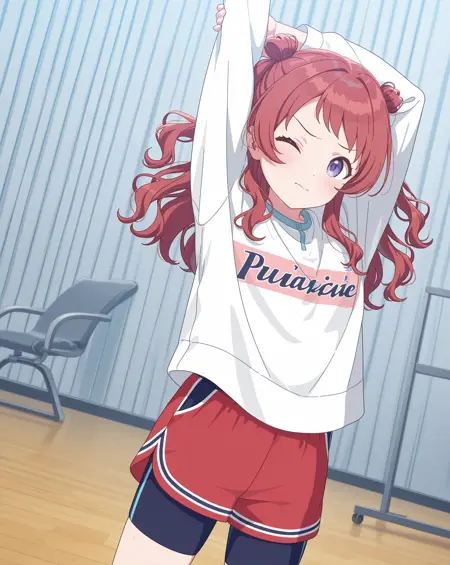 ベース:saki765pro、赤髪、青い目、長い髪、髪の結び目、二重の結び目、両サイドアップ、紫色の目、中程度の胸