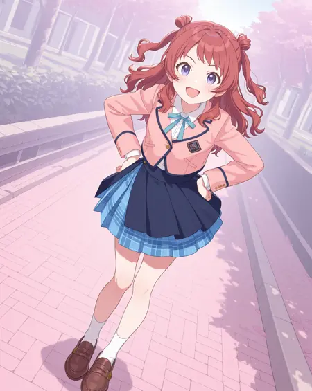 School Uniform (Updated in V2): skirt, jacket, long sleeves, socks, pleated skirt, blue skirt, school uniform, ribbon, pink jacket, shoes, plaid skirt, plaid, white socks, neck ribbon, loafers, brown footwear