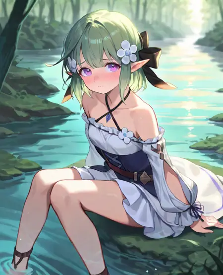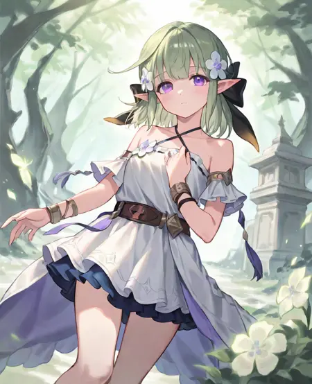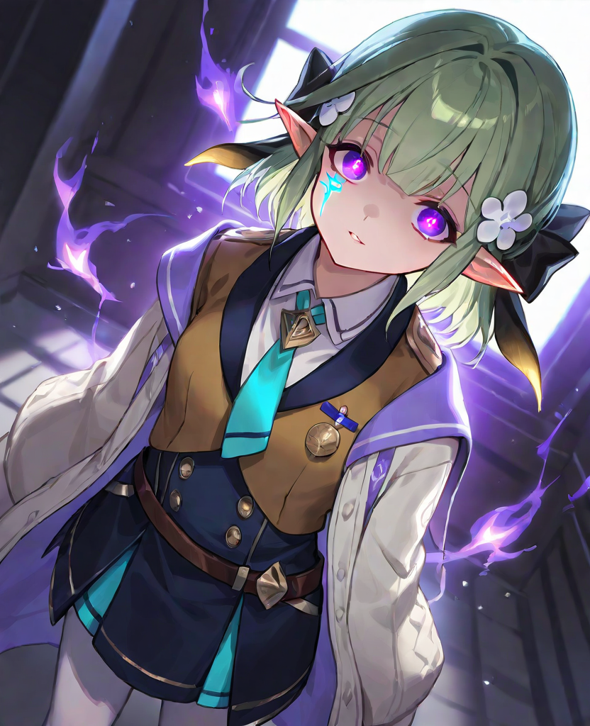 green hair , purple eyes , ( ) hair ornament , pointy ears , ( hair bow ) ;