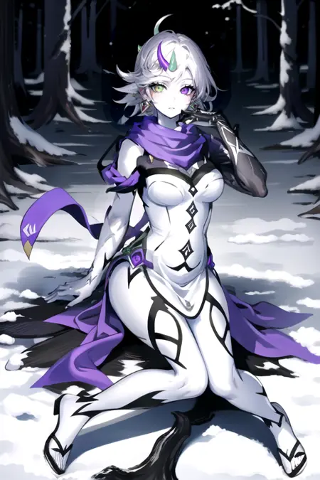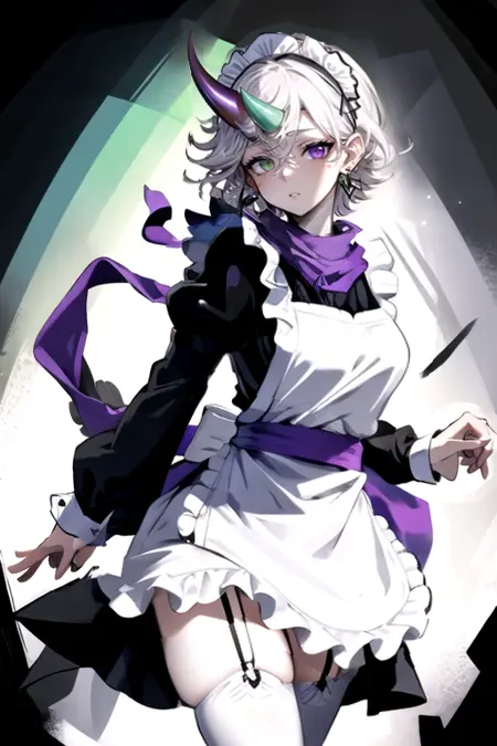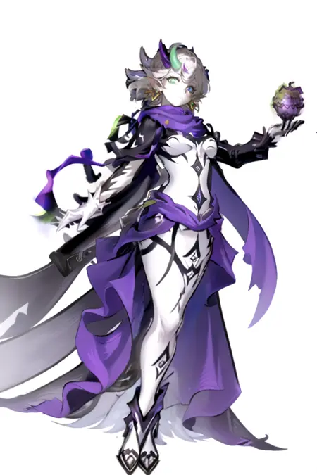 より完全な外観を得るために追加のタグ: horns, white skin, multicolored hair, purple scarf, green eyes, purple eyes, earrings, white hair, jewelry, pointy ears, grey hair, single horn, hat, dress, heterochromia, short hair, vines