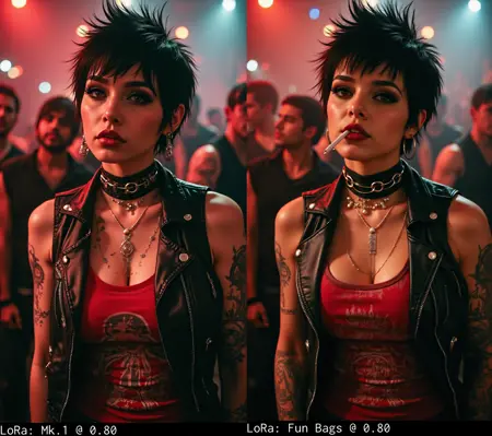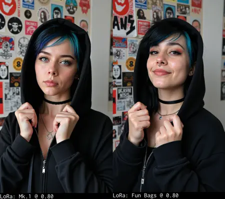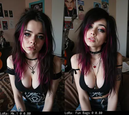 0.60for subtle effect (not really subtle, but toned down)0.80for bold alt/goth vibe1.00for full-on over-the-top alt goth energy (may require seed hunting and balancing with other LoRAs to reduce shiny skin)