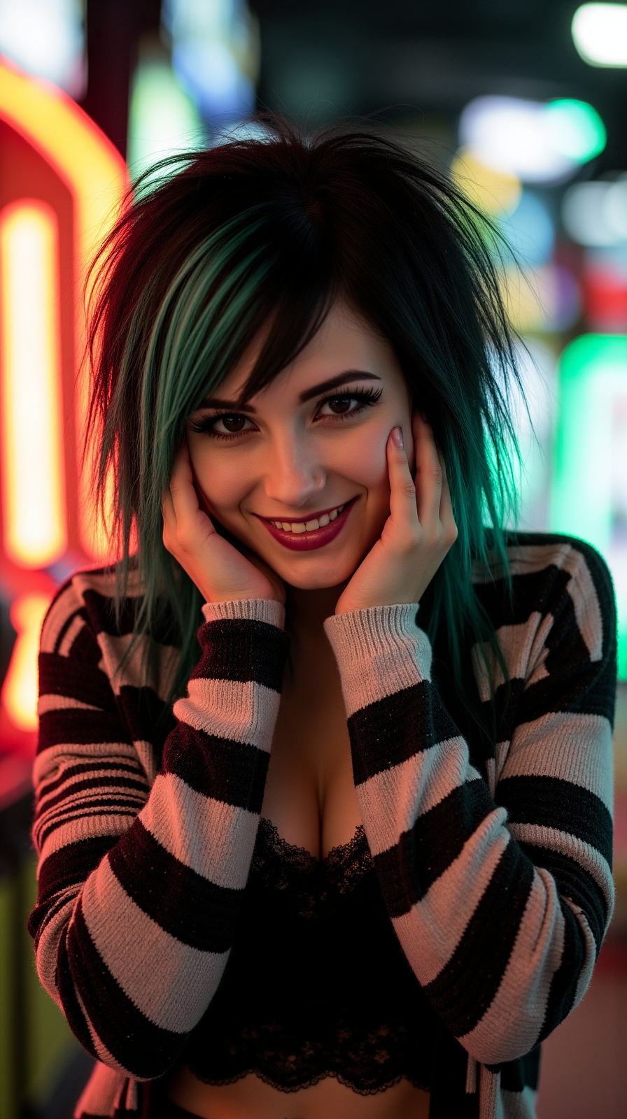 long black hair streaked [Color], big breasts, skinny body, arm warmers, plaid skirt, fishnet tights, neon lights, mall food court, diner booth, arcade machines, graffiti wall, studded belt, zebra print, layered tanks, playful expression, candid pose, dramatic streak colors, emo hairstyle