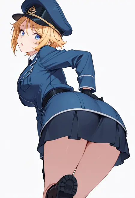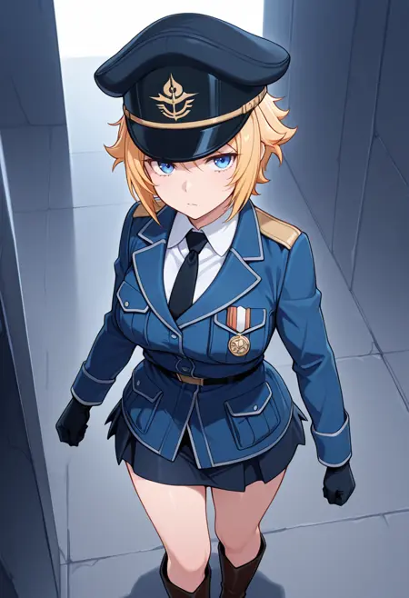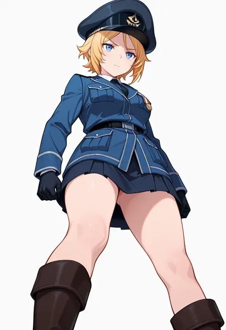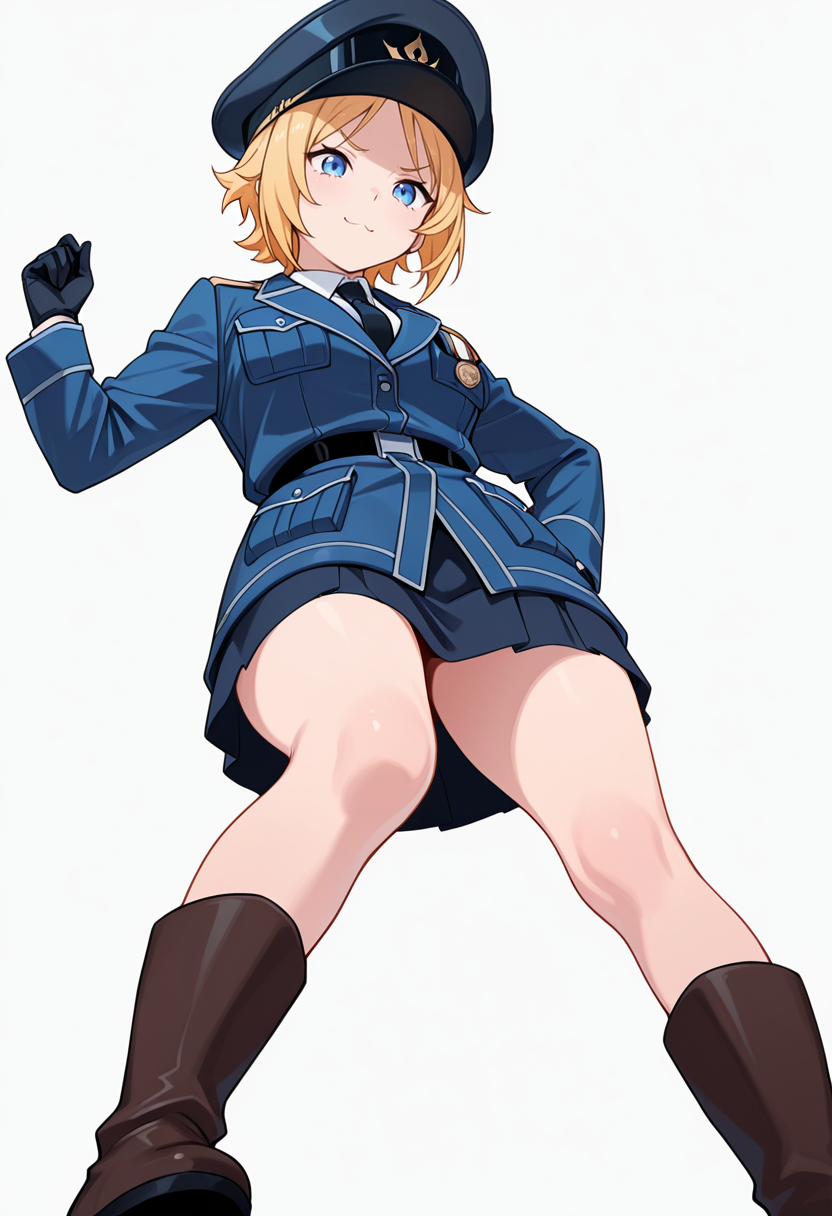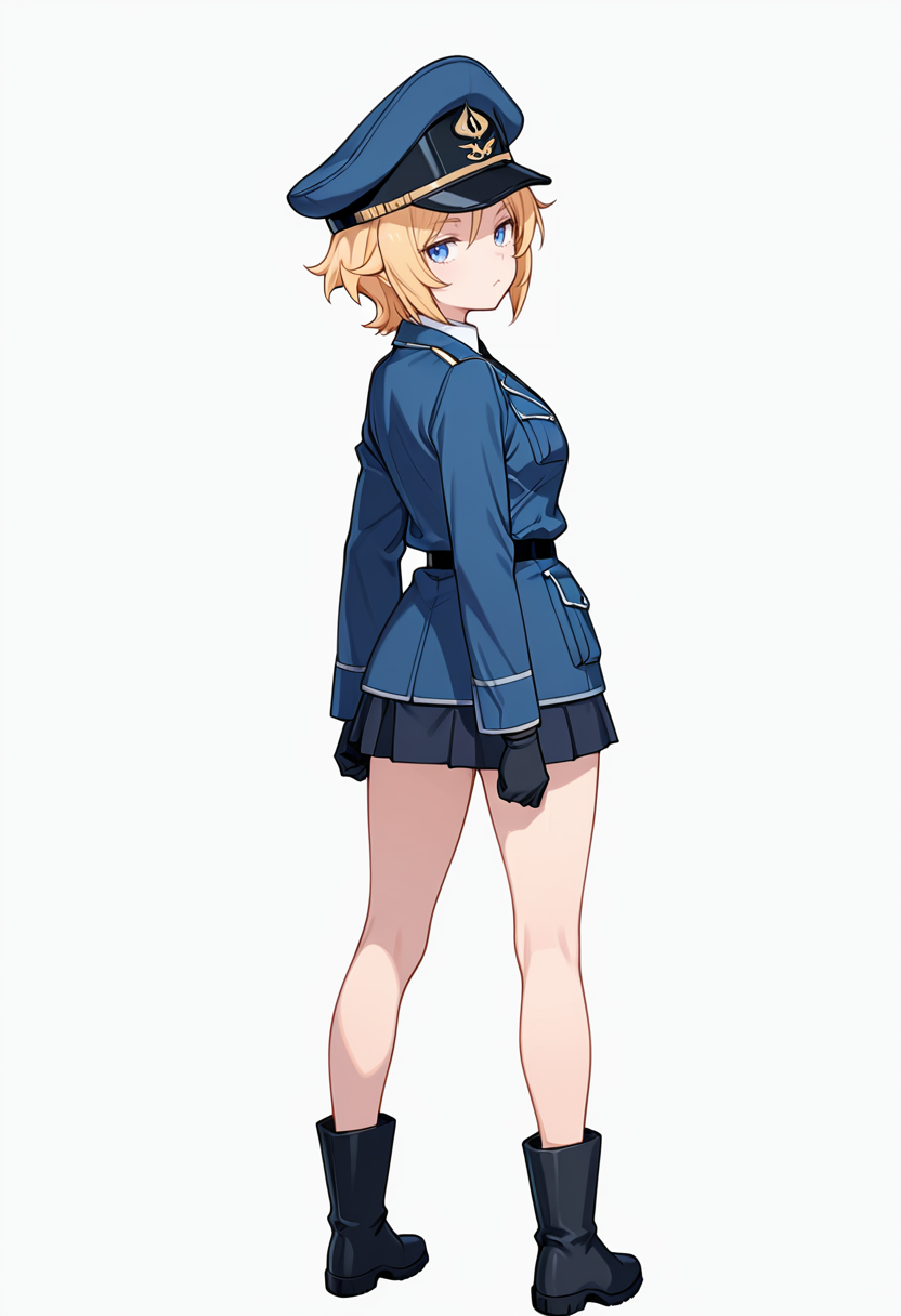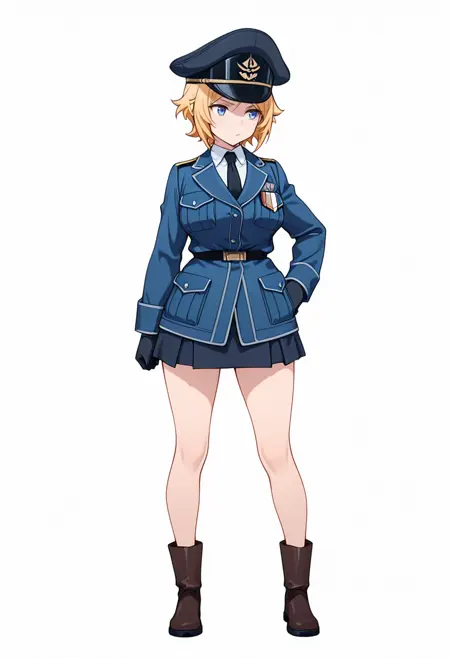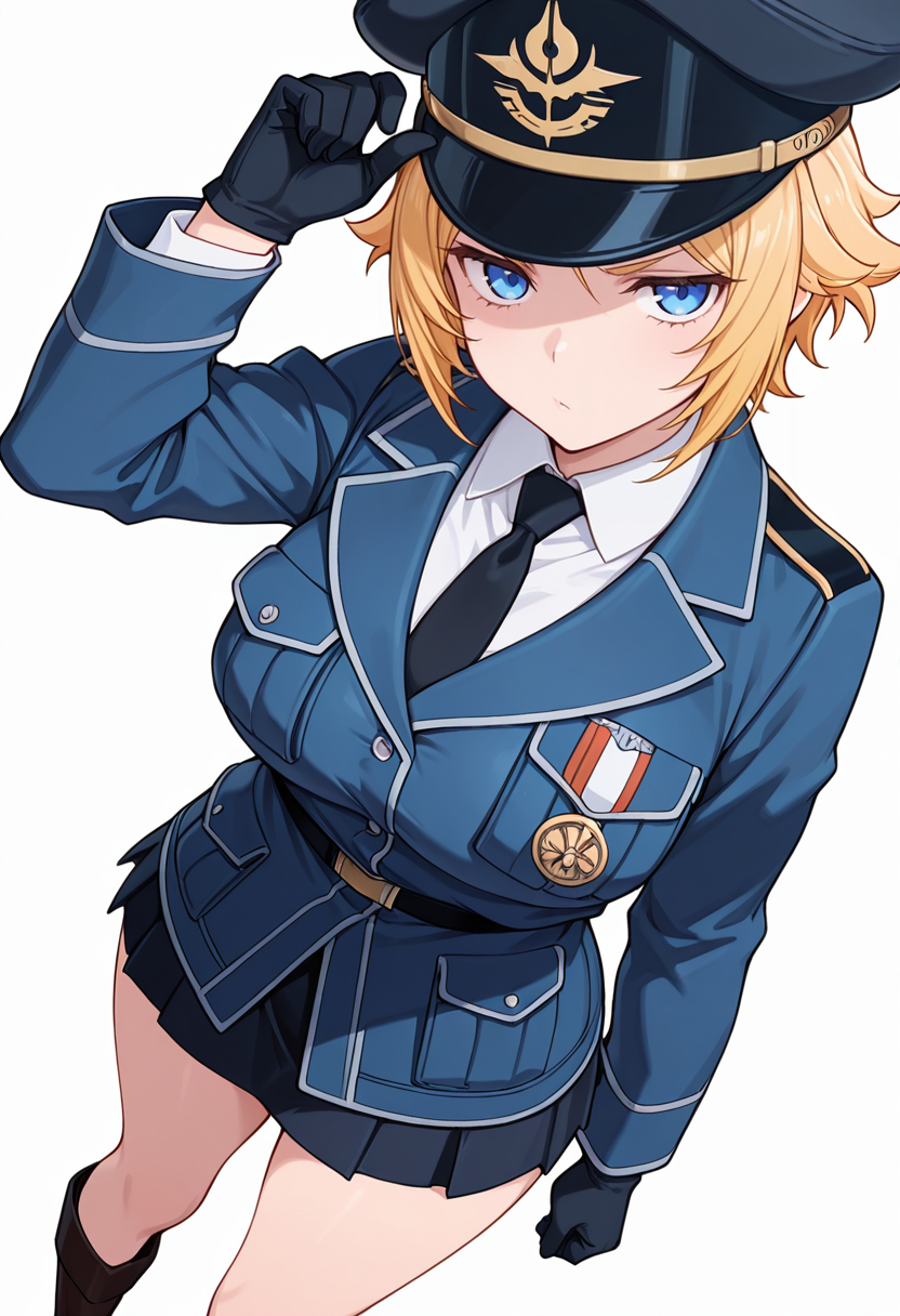 chris_s1,military uniform,blue jacket, collared shirt, black necktie, skirt, military hat,cap, black gloves, boots,