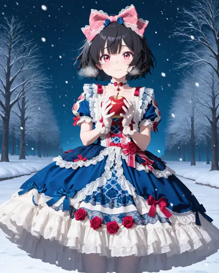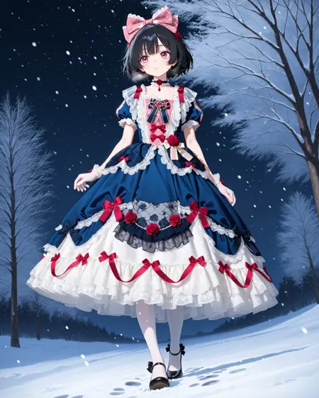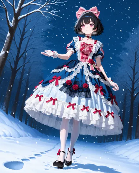 女孩黑发凌乱,肤色如雪,身着一条工艺繁复、装饰华丽的长裙,茫然行走在雪夜之中。