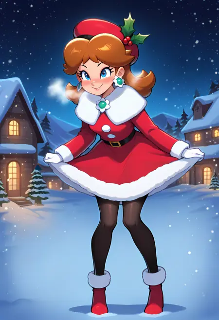 Holiday: D41syH0l1, princess daisy, brown hair, flipped hair, blue eyes, fur-trimmed dress, red santa dress, white gloves, red beret, holly hair ornament, black pantyhose
