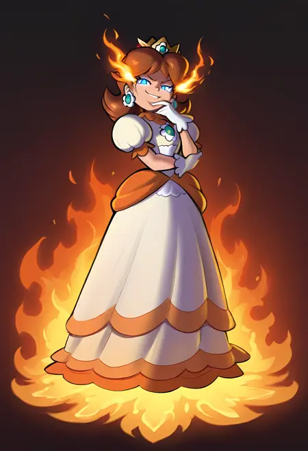 Fire Flower: D41syF1r3, princess daisy, brown hair, flipped hair, blue eyes, white dress, puffy short sleeves, white frilled gloves, fire