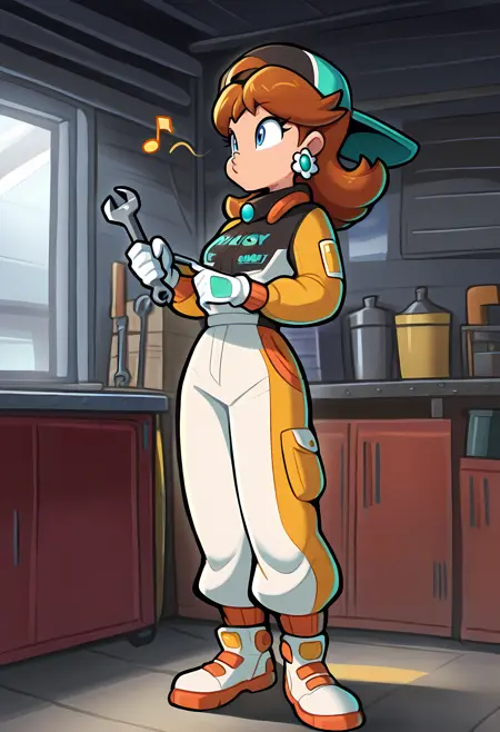 Pro-Racer: D41syPr0R4c3, princess daisy, brown hair, flipped hair, blue eyes, multicolored jumpsuit, baseball cap, backwards hat, white gloves