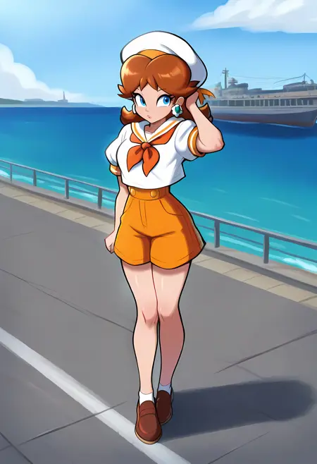 Sailor: D41syS41l0r, princess daisy, brown hair, flipped hair, blue eyes, sailor hat, white sailor shirt, short sleeves, sailor collar, orange neckerchief, high-waist shorts, orange shorts