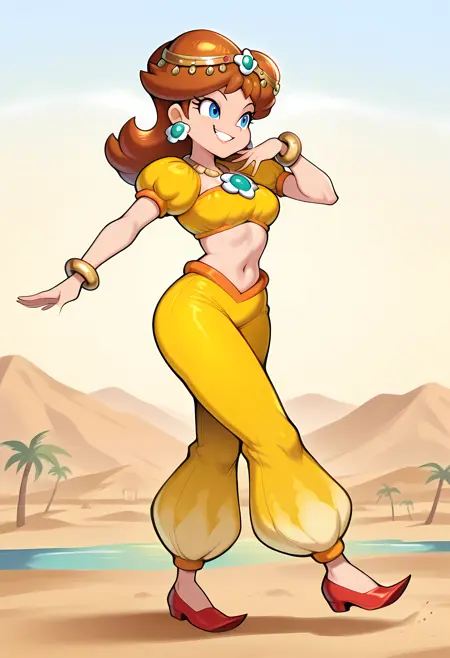 Oasis: D41sy_04s1s, princess daisy, brown hair, flipped hair, blue eyes, arabian clothes, yellow harem top, yellow harem pants, baggy pants, midriff, red footwear, circlet