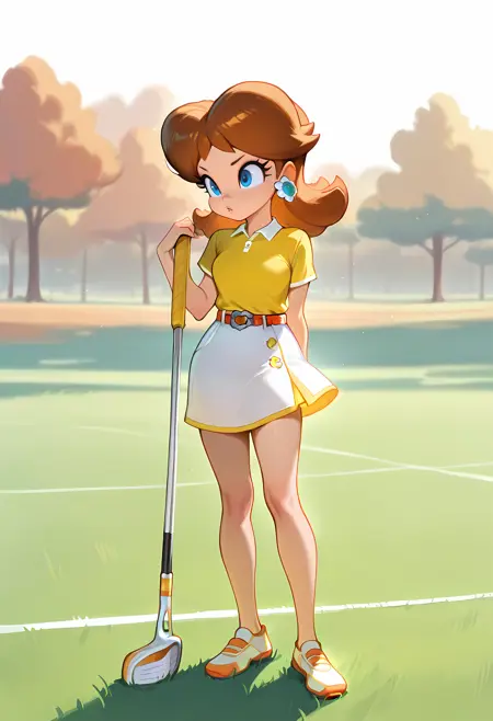 Golf: D41syG0lf, princess daisy, brown hair, flipped hair, blue eyes, white sports skirt, yellow polo shirt, belt, golf club