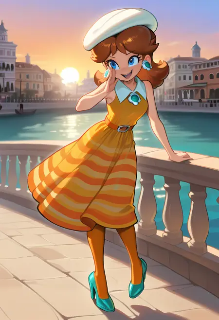 Vacation: D41syV4c4y, princess daisy, brown hair, flipped hair, blue eyes, collared dress, sleeveless dress, short striped dress, white beret, orange pantyhose, aqua high heels