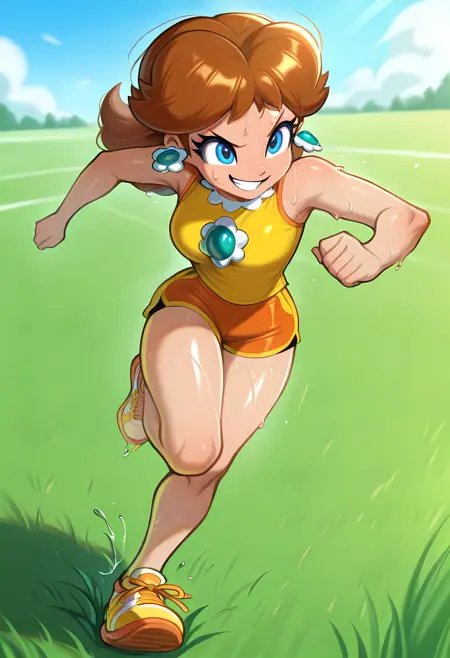 Sports: D41sySp0rt, princess daisy, brown hair, flipped hair, blue eyes, sleeveless yellow shirt, orange sports shorts, short shorts, sportswear, brooch, sneakers
