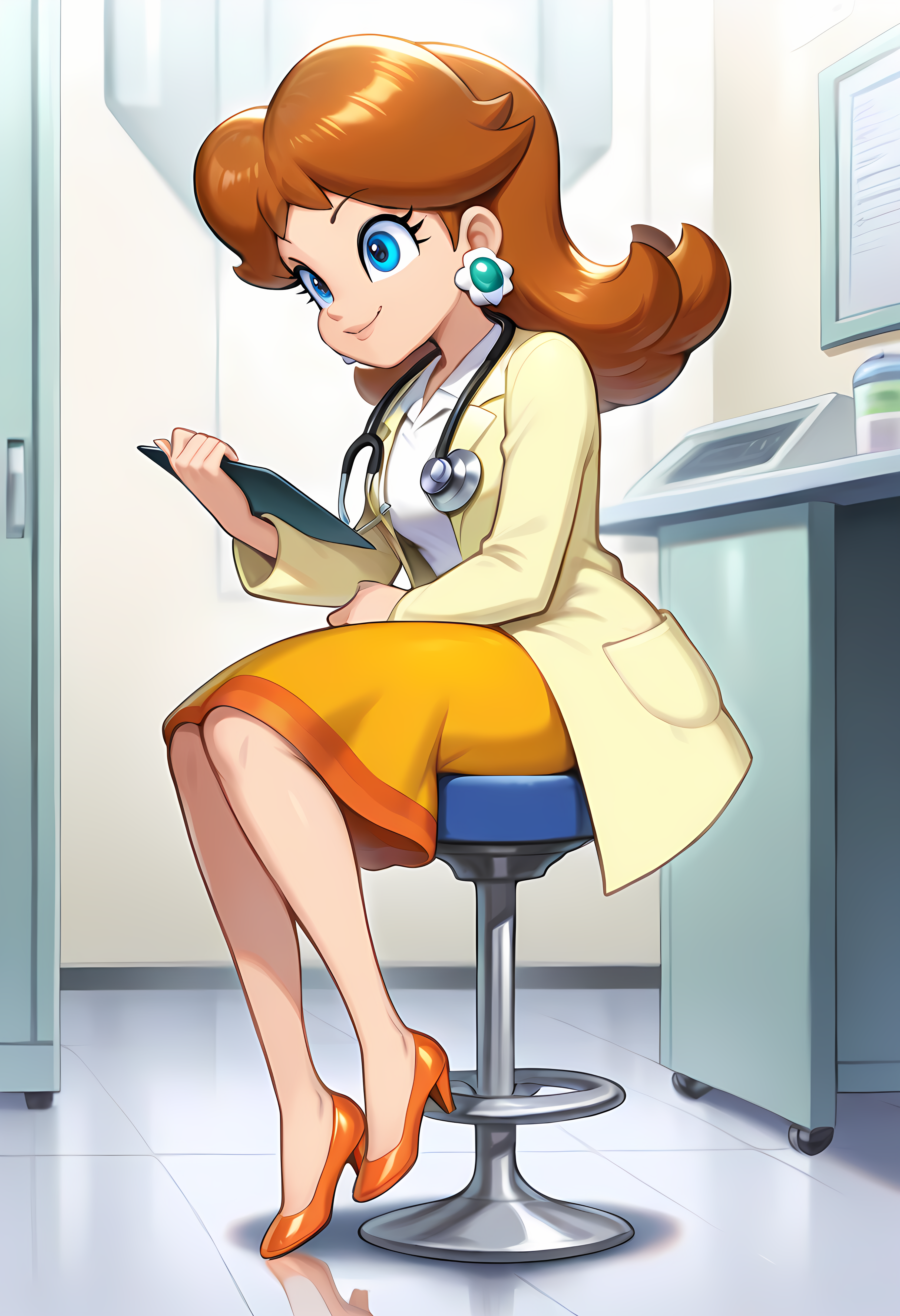 Doctor: D41syD0ct, princess daisy, brown hair, flipped hair, blue eyes, yellow coat, collared white shirt, stethoscope, orange skirt, doctor