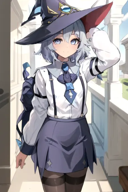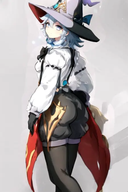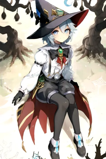 更多标签以确保获得完整外观:蓝眼睛,女巫帽,短发,衬衫,长袖,白衬衫,蓬松袖子,黑色蝴蝶结,宝石,背带裤,眼睛之间的头发,短裤,黑色手套,黑色鞋履,黑色连裤袜
