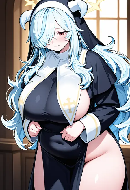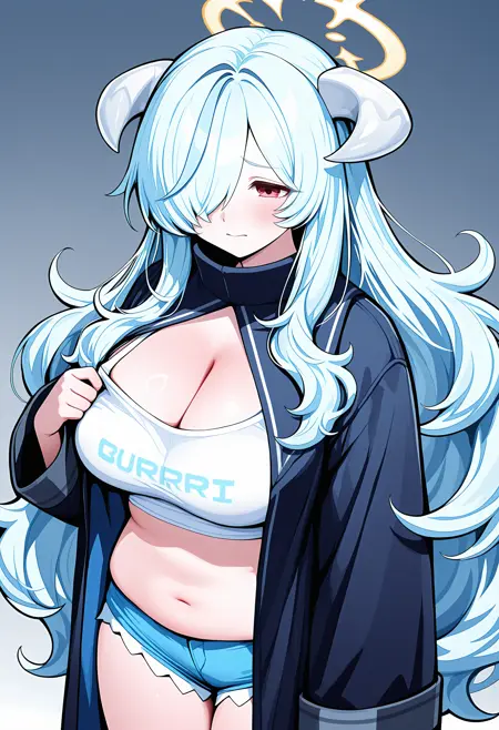 关键词:doubliel,白色和蓝色的角,黄色假光晕,头发遮住一只眼睛,tareme,蓝色头发,流口水,背心,背心上的文字,短裤,胸部,腹部,深色外套,长袖,1个女孩,单独,修女面纱