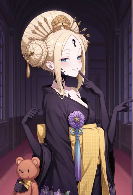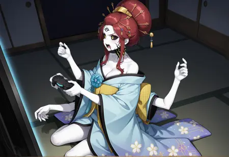 태그: (추가 팔:1.4), 점 모양 눈썹, 이마 보석, 립스틱, 텅 빈 눈, 아이라인, 팔찌, 검은 머리카락, 단일 머리 둥글게, 머리 장식, 중국식 머리핀, 하얀 피부, 색상이 있는 피부, 몬스터 걸, 부패, 몸 표식, 파란색 몸 표식, 검은 공막, 파란 눈, 빨간 띠, 일본식 복장, 검은 기모노, 드레스 꽃